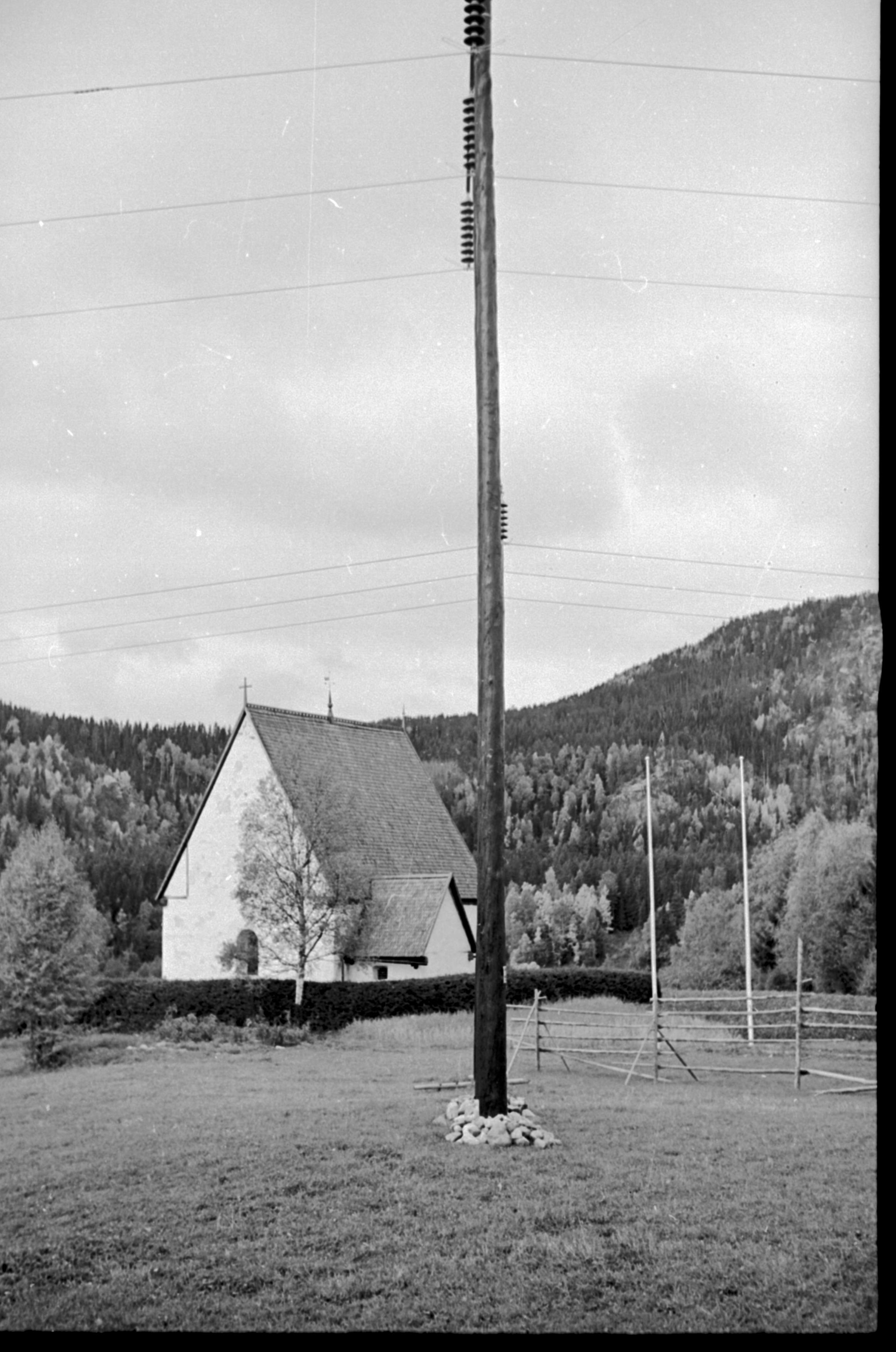 Kyrkan från nordöst. Bilden avser att illustrera kraftledningens läge i förhållande till kyrkan.