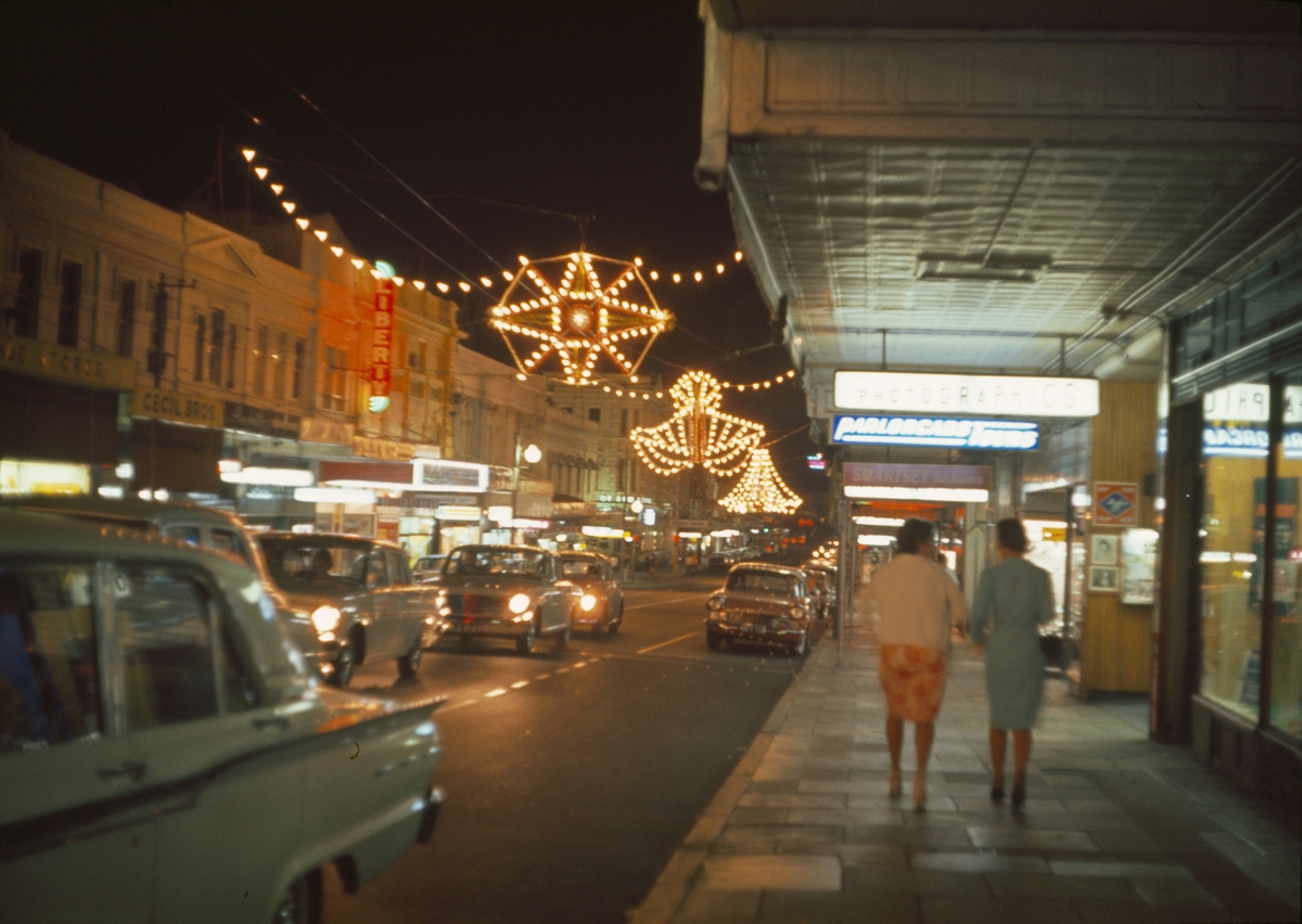 Bilden visar en biltraffikerad gata i Freemantle på nattetid.