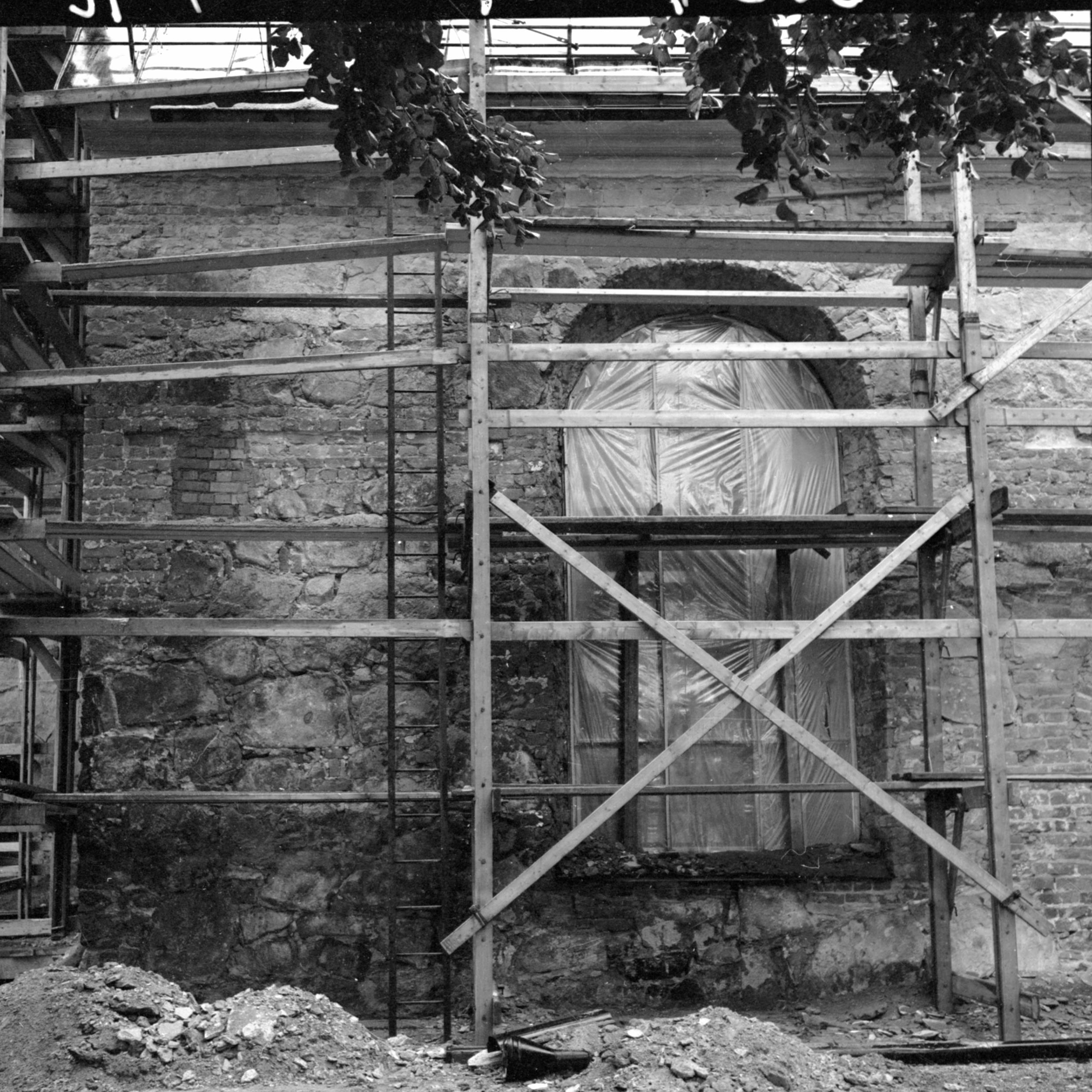 Långhusets sydfasad fotograferad från väster mot öster. Byggnadshistorisk undersökning i samband med omputsning 1963. Foto nr. 27.