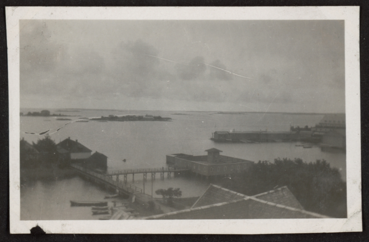 Bilden föreställer en vy från tornet av Slup- och barkassjkulet över laboratorieholmen och kungshall. I förgrunden syns taket från Sob och i mitten kallbadhuset och broar som binder samman öarna.