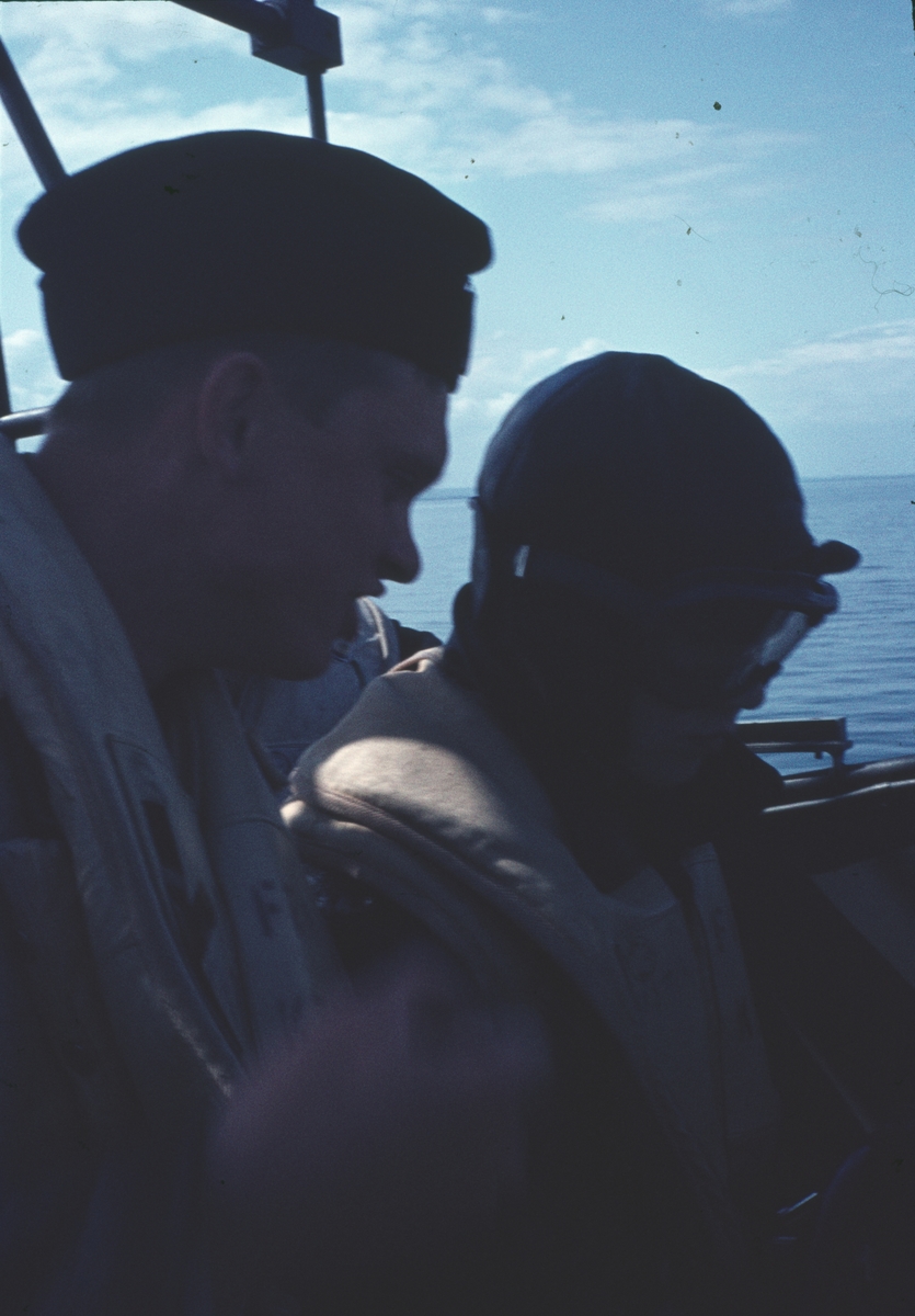 Bilden visar en besättningsmän med besökare i skyddskläder ombord på en motortorpedbåt.