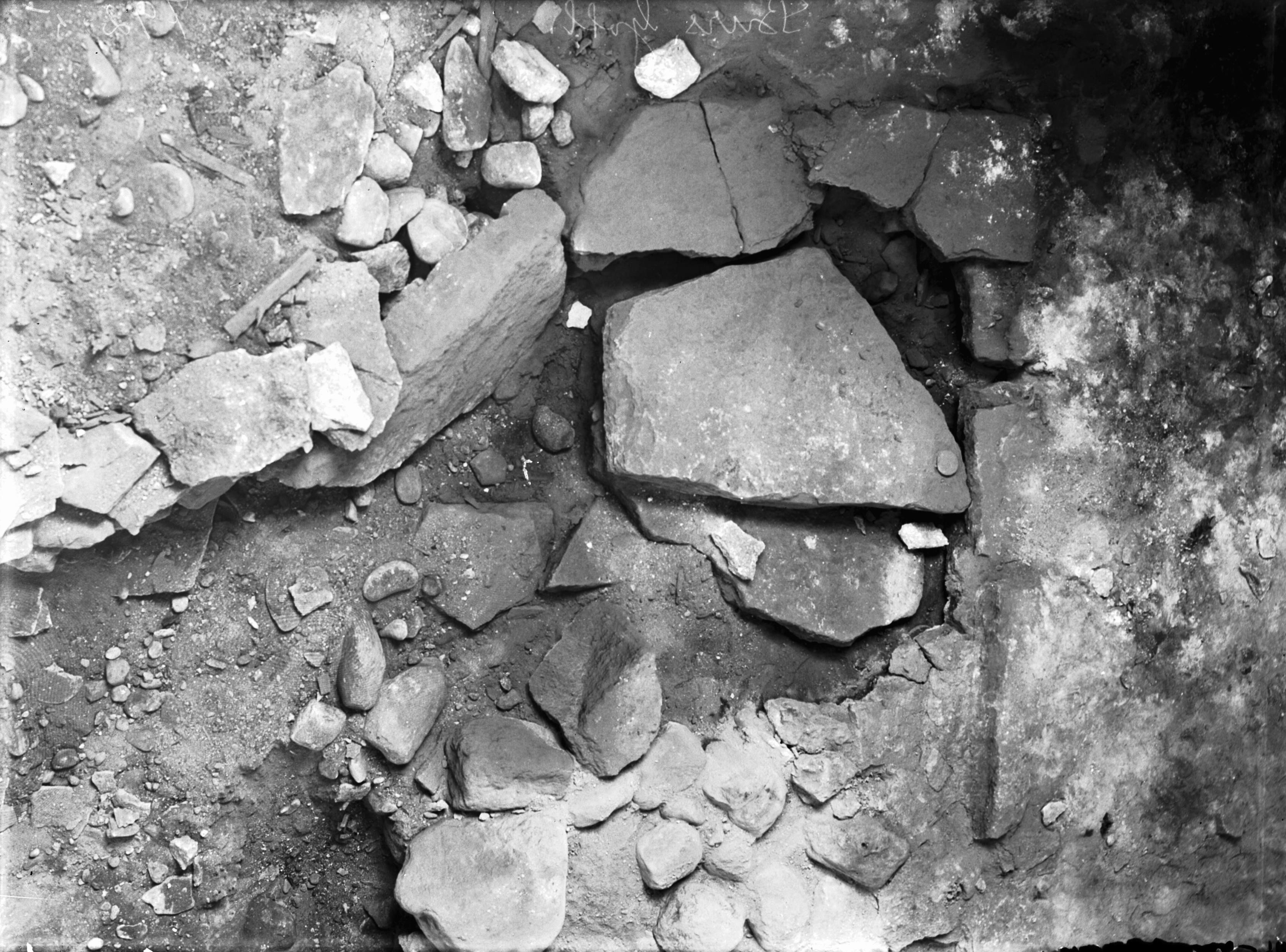 Utgrävning, södra triumfbågstödets grund, gamla kyrkan.