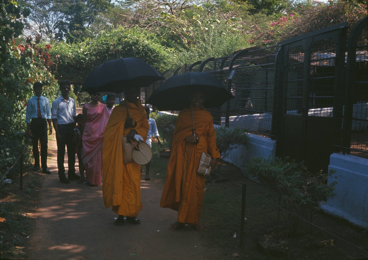 Bilden visar två buddistmunkar på promenad genom Colombos djurpark.