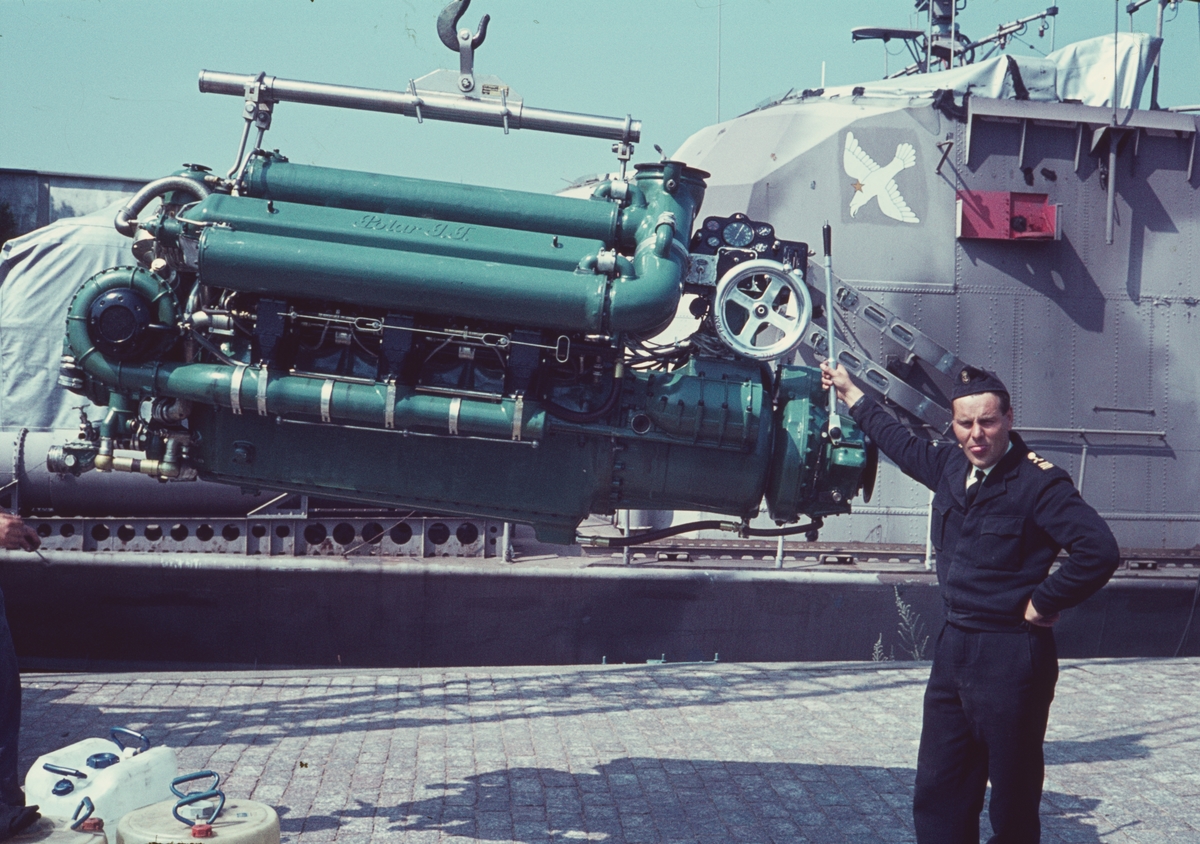 Bilden visar en flygplansmotor till en motortorpedbåt hängande på en lyftanordning. Bredvid poserar en menig från maskinavdelningen.