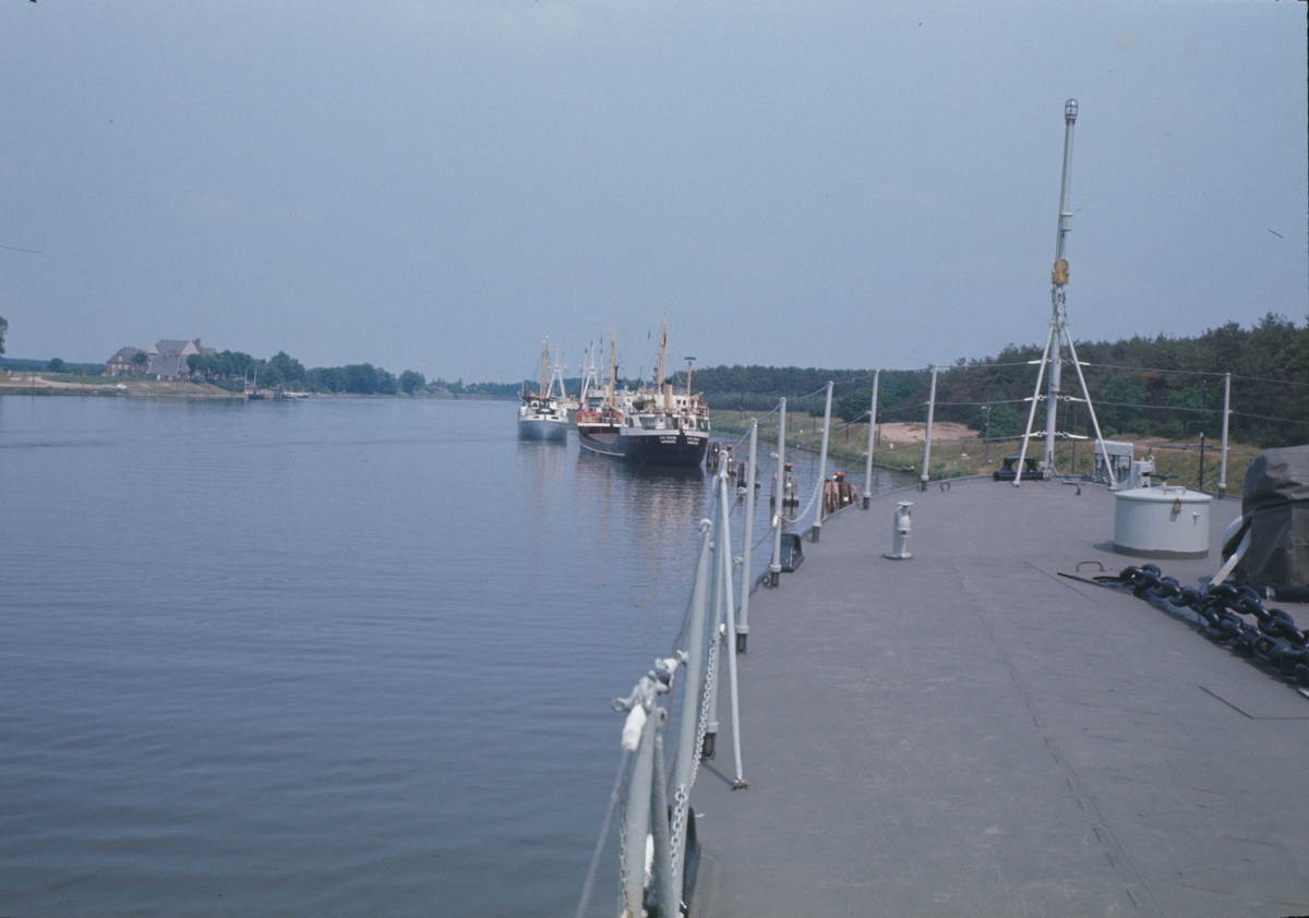 På bilden syns förskeppet av jagaren Öland som följer en rad handelsfartyg genom Kielkanalen.