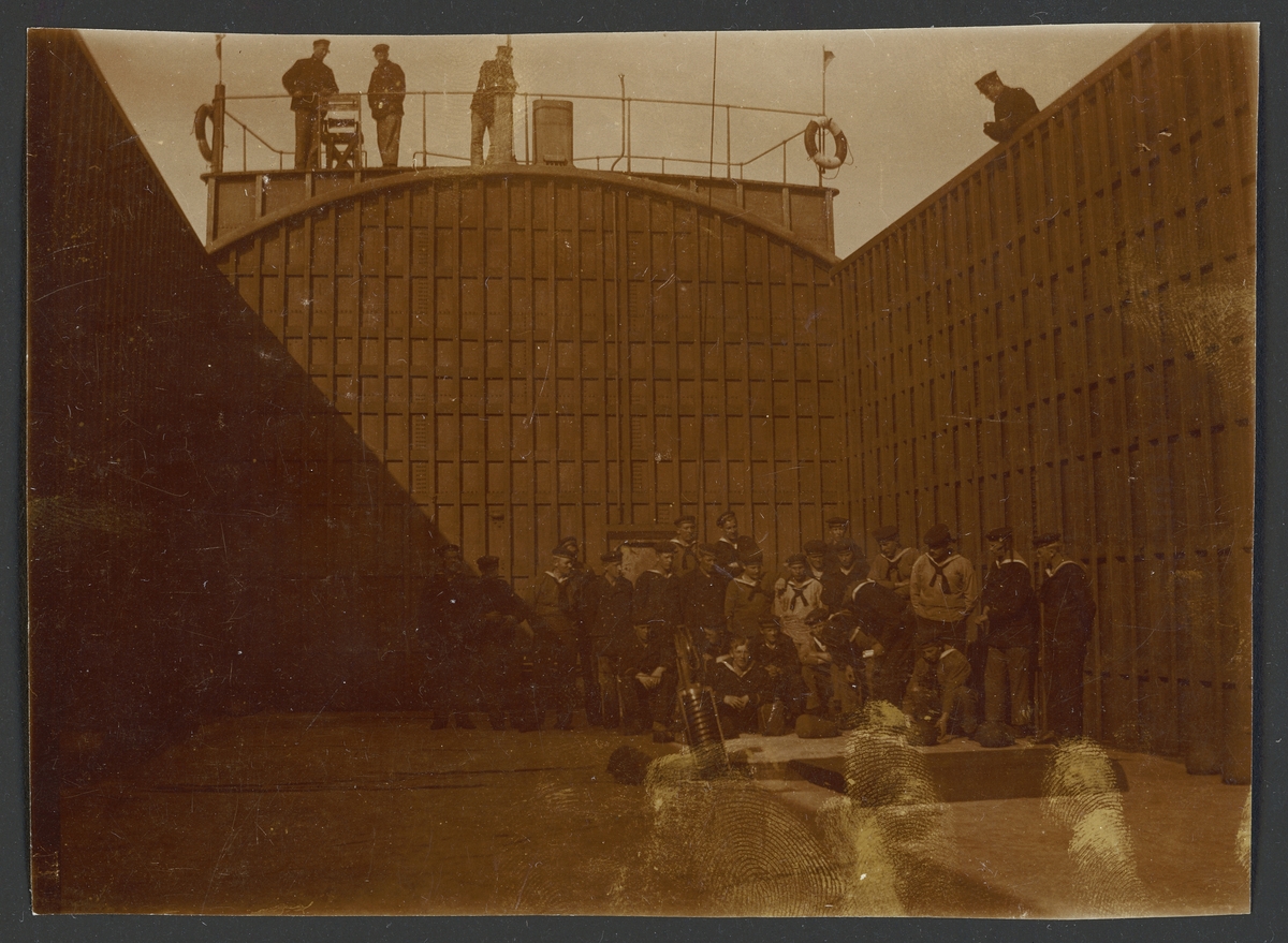 Bilden visar manskapet på Ballongfartyget nr 1 som har samlats i lastutrummet.