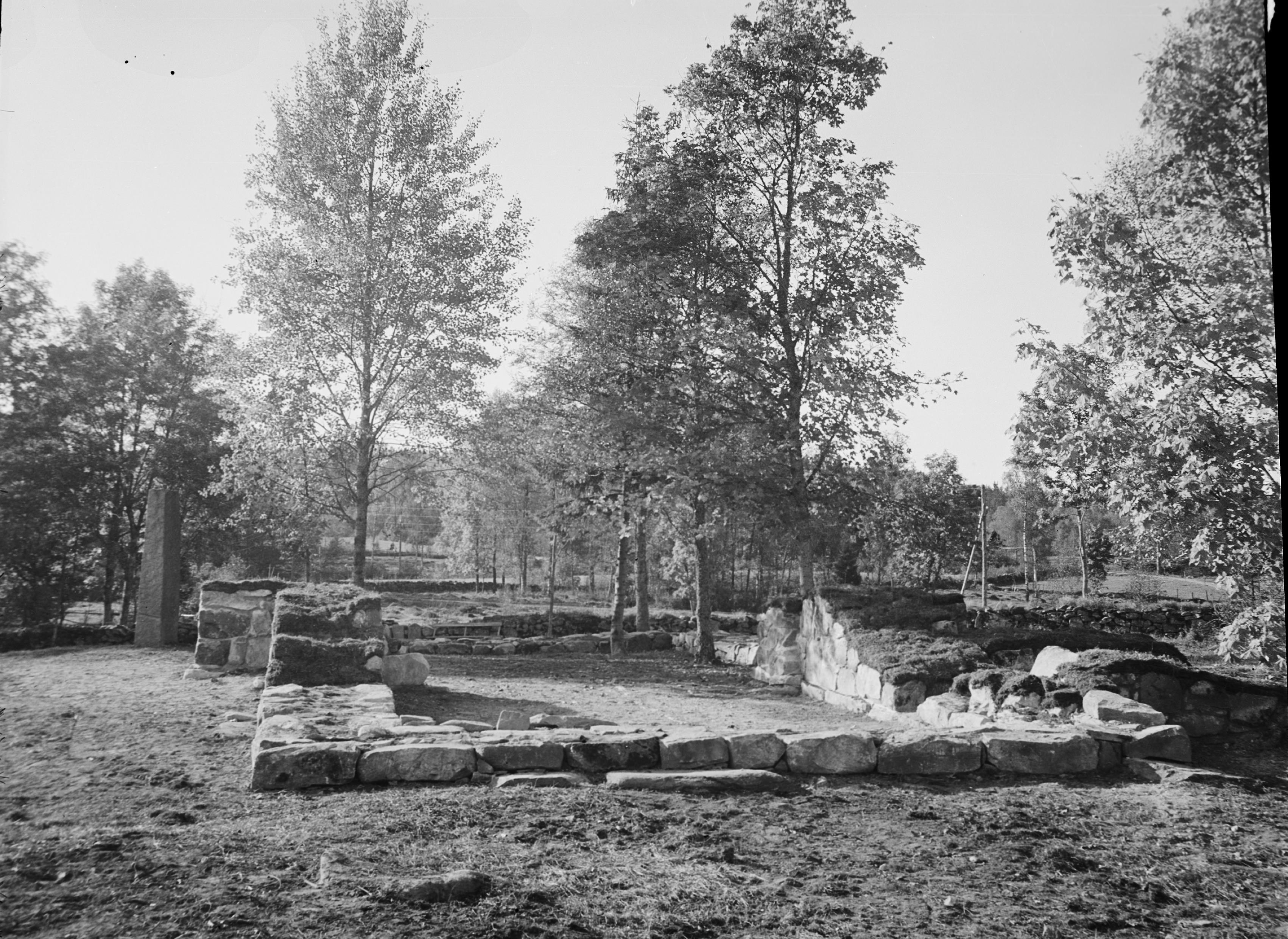 Kyrkoruinens mursträckningar förhöjda och konserverade, från väster.