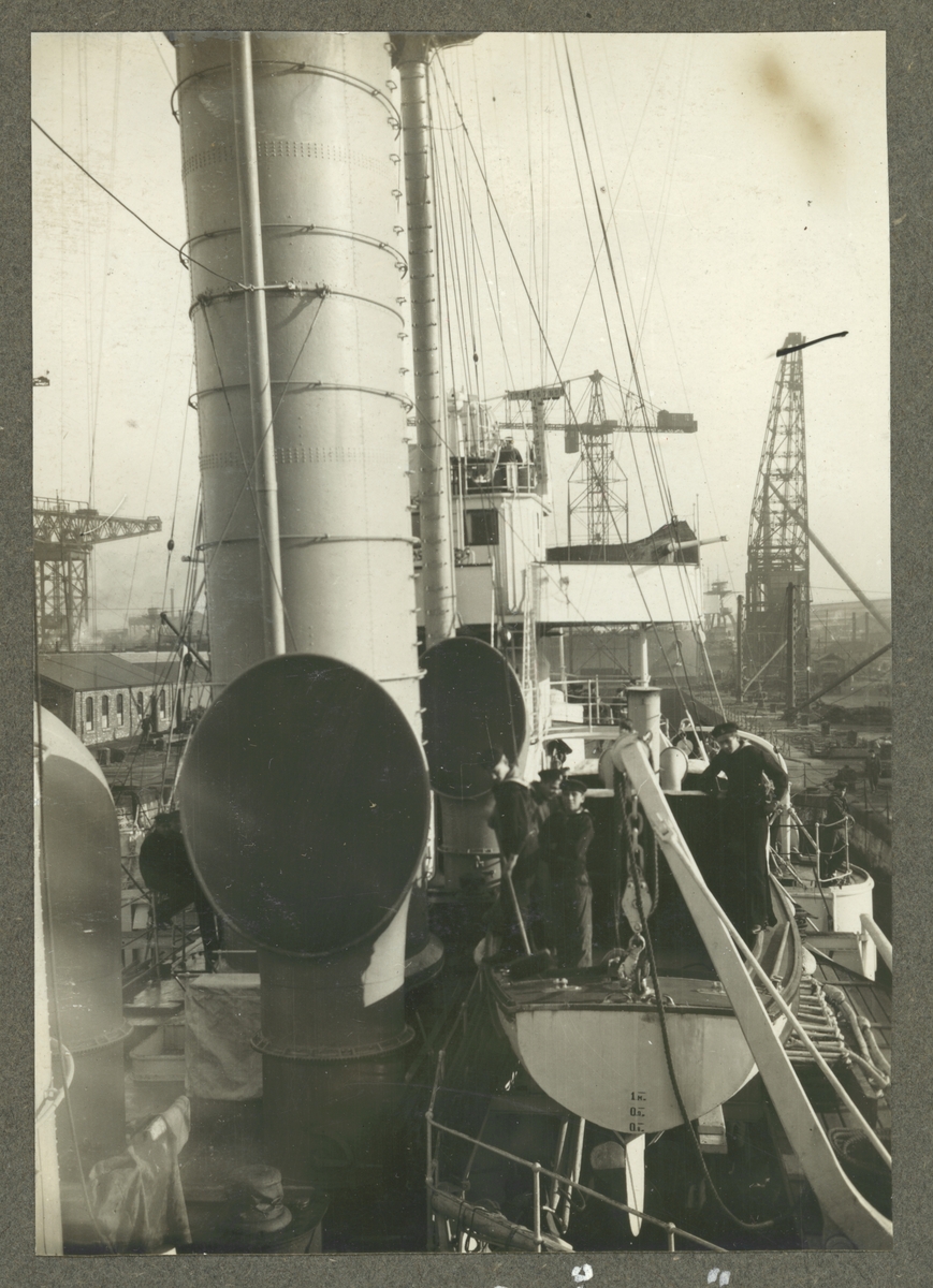 Bilden visar några sjömän som står i en av Fylgias livbåtar.