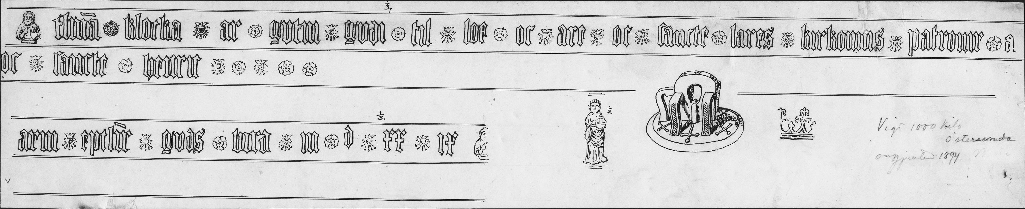 Storklockan, efter omgjutningskiss 1894 av inskriptionen på den gamla klockan från 1529.