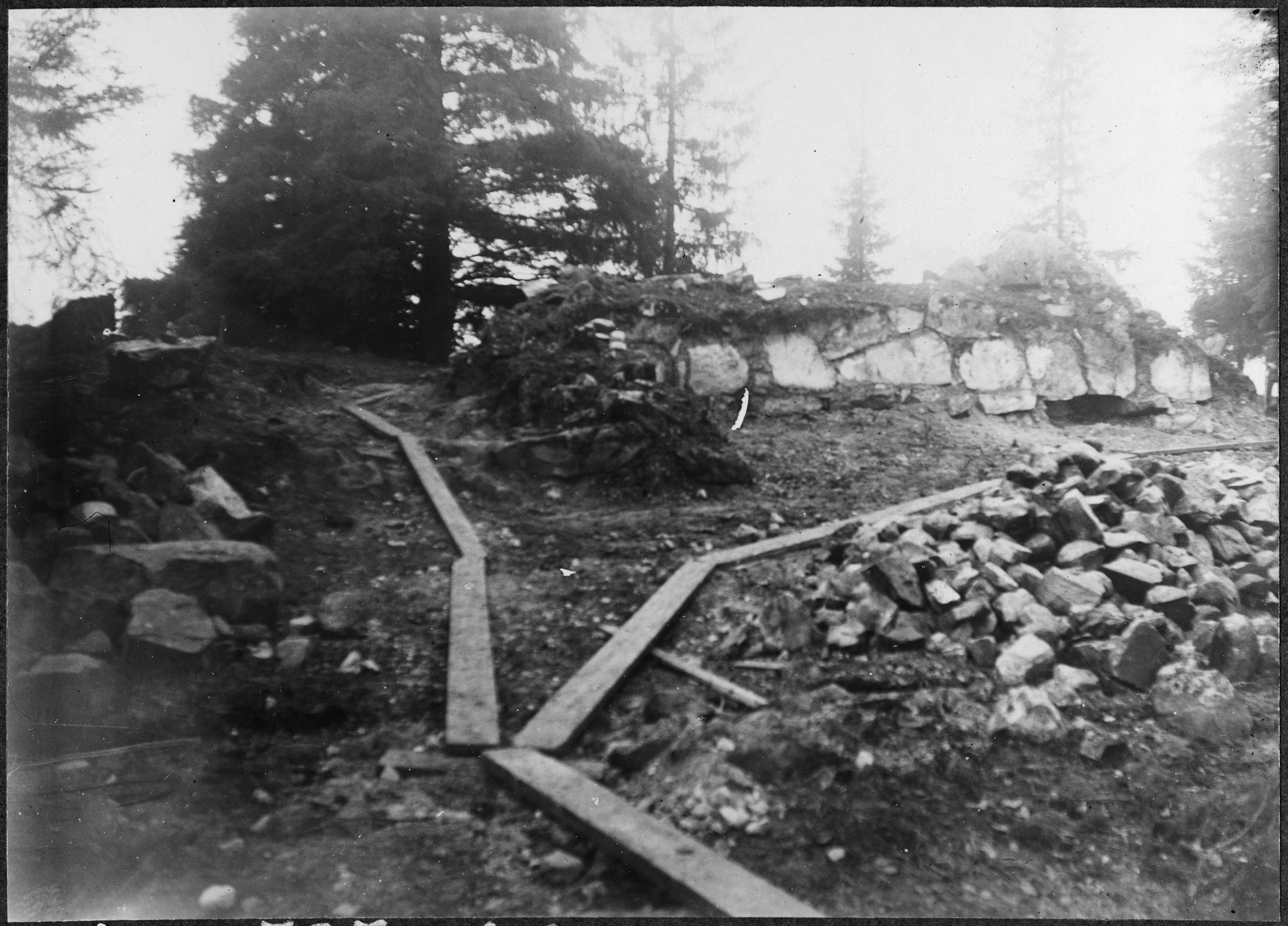 Kyrkoruinen med lämningar av sakristia och kyrkans långsida. Till höger den sönderbrutna grundmuren.