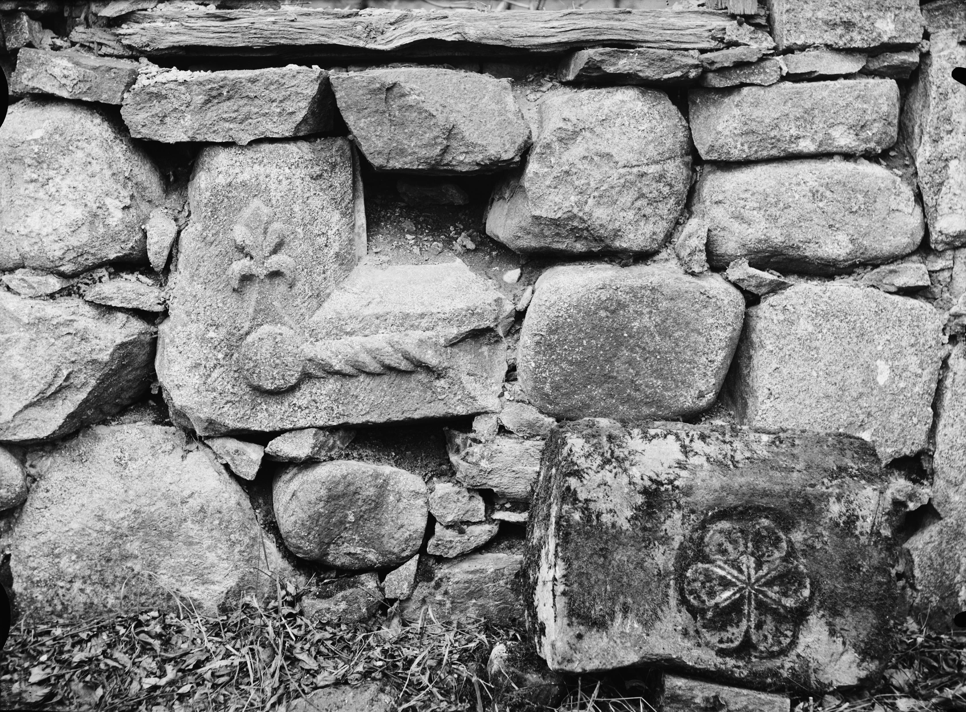 Skulpterade stenar i och bredvid muren.
