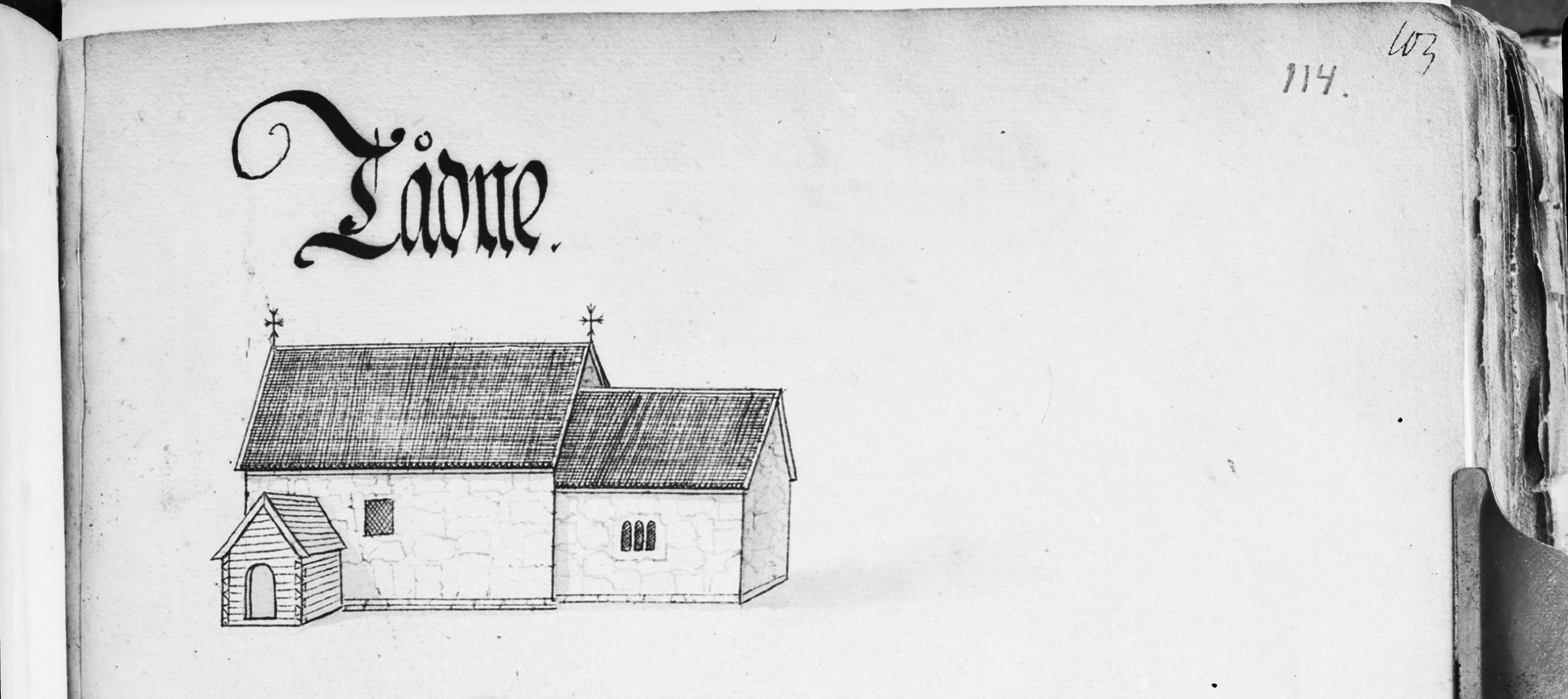 Beskrivning: Kyrkan från söder, teckning i Peringskiölds Monumenta, avfotograferad.