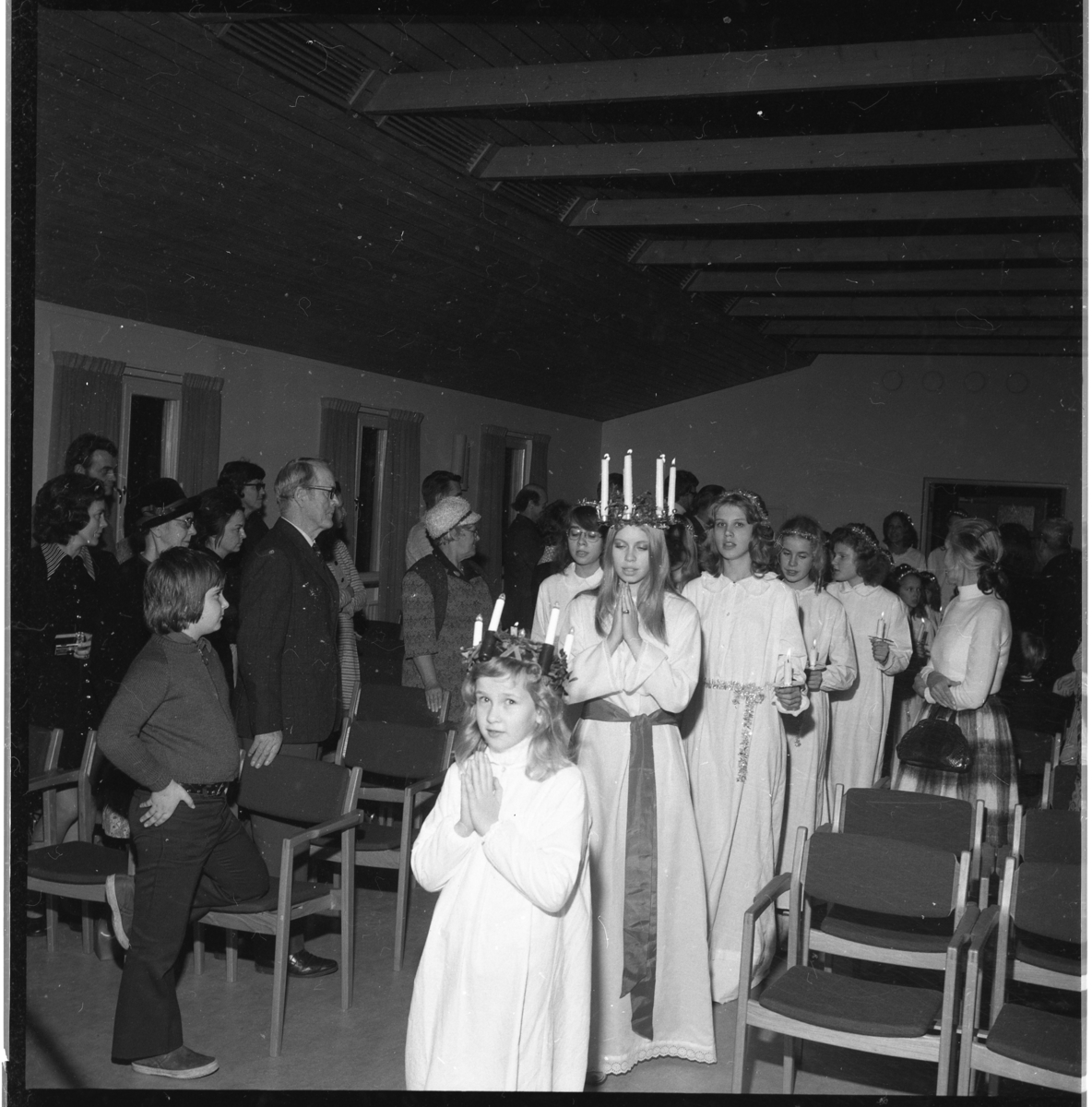 Luciatåg i Gränna 1972. En liten lucia går för en vuxen lucia.