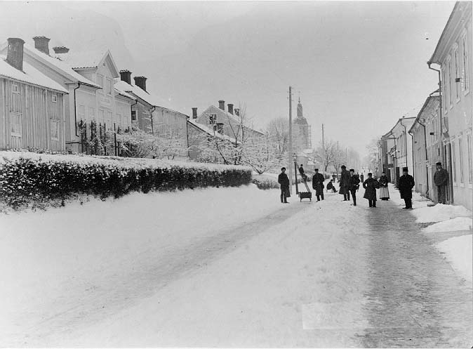 Brahegatan vintertid. Ett flertal personer i bild, vända mot fotografen. Namngivna är lykttändaren "Påskagrålle" till vänster (möjligen på stegen vid lyktstolpen), Alfred Blomgren, Skärling på trottoaren samt handlanden Otto Zander vid dörren till höger.