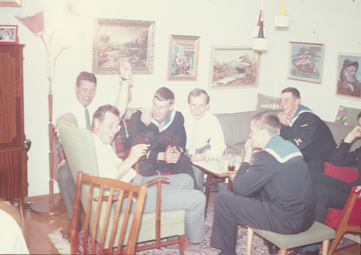 Bilden visar en grupp unga män dels i sjömanskostym dels i civila kläder som sitter runt ett bord och skämtar.