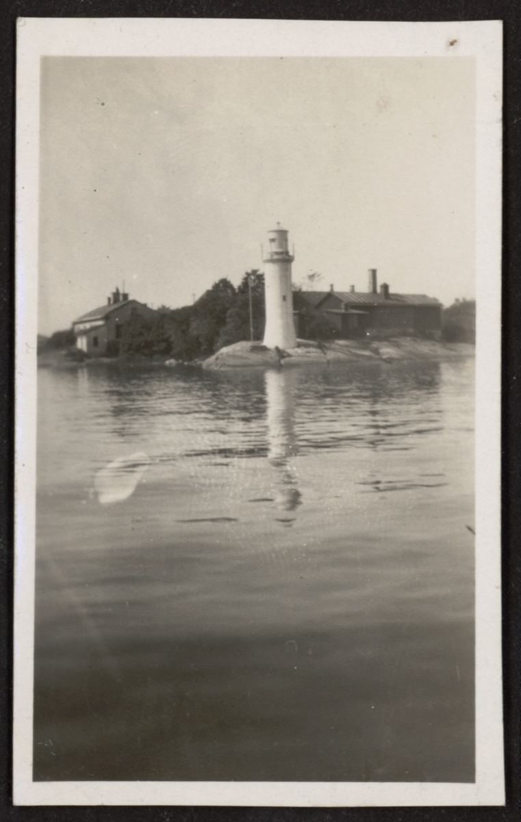 Bilden föreställer en vy på Laboratorieholmen från havet. I centrumet syns fyren till höger Desinfektionshuset och till vänster Kokhuset.