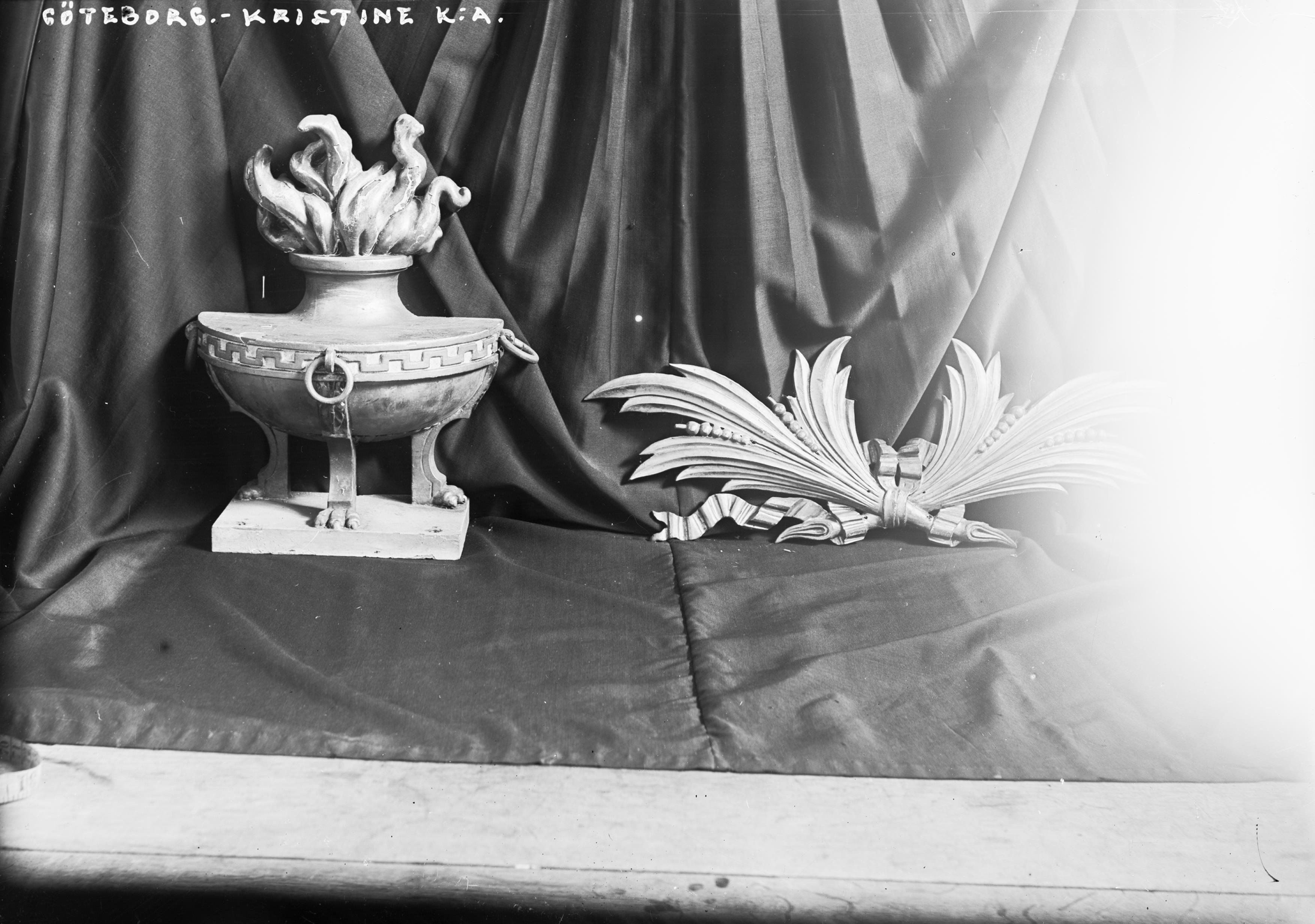Trefot och palmkvistar, har möjligen utgjort krön till gallergrind mellan Aschebergska gravkoret och kyrkan. Snabbinv.