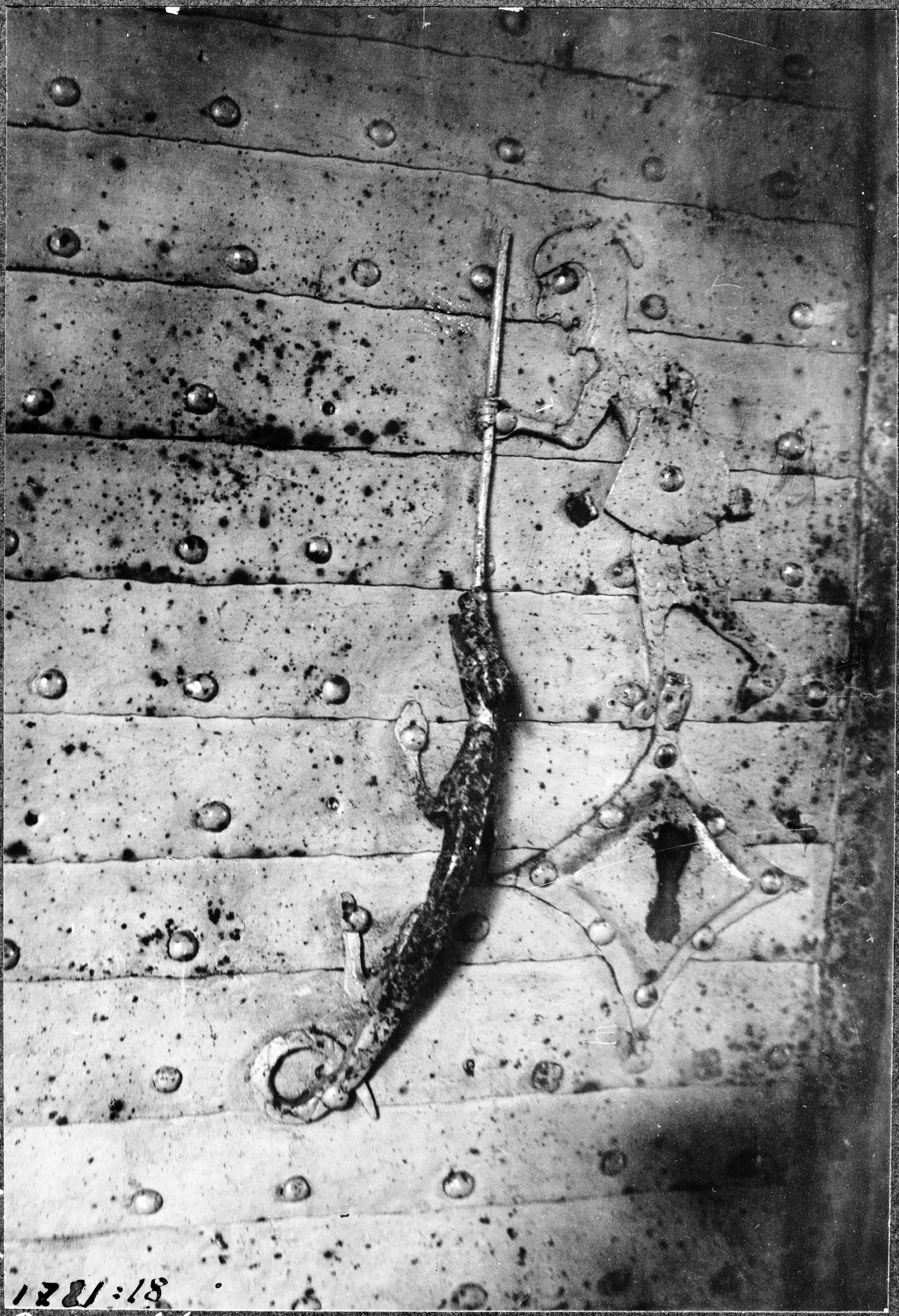 Beslag av järn på sakristiedörren, föreställande S:t Göran och draken. Snabbinv.