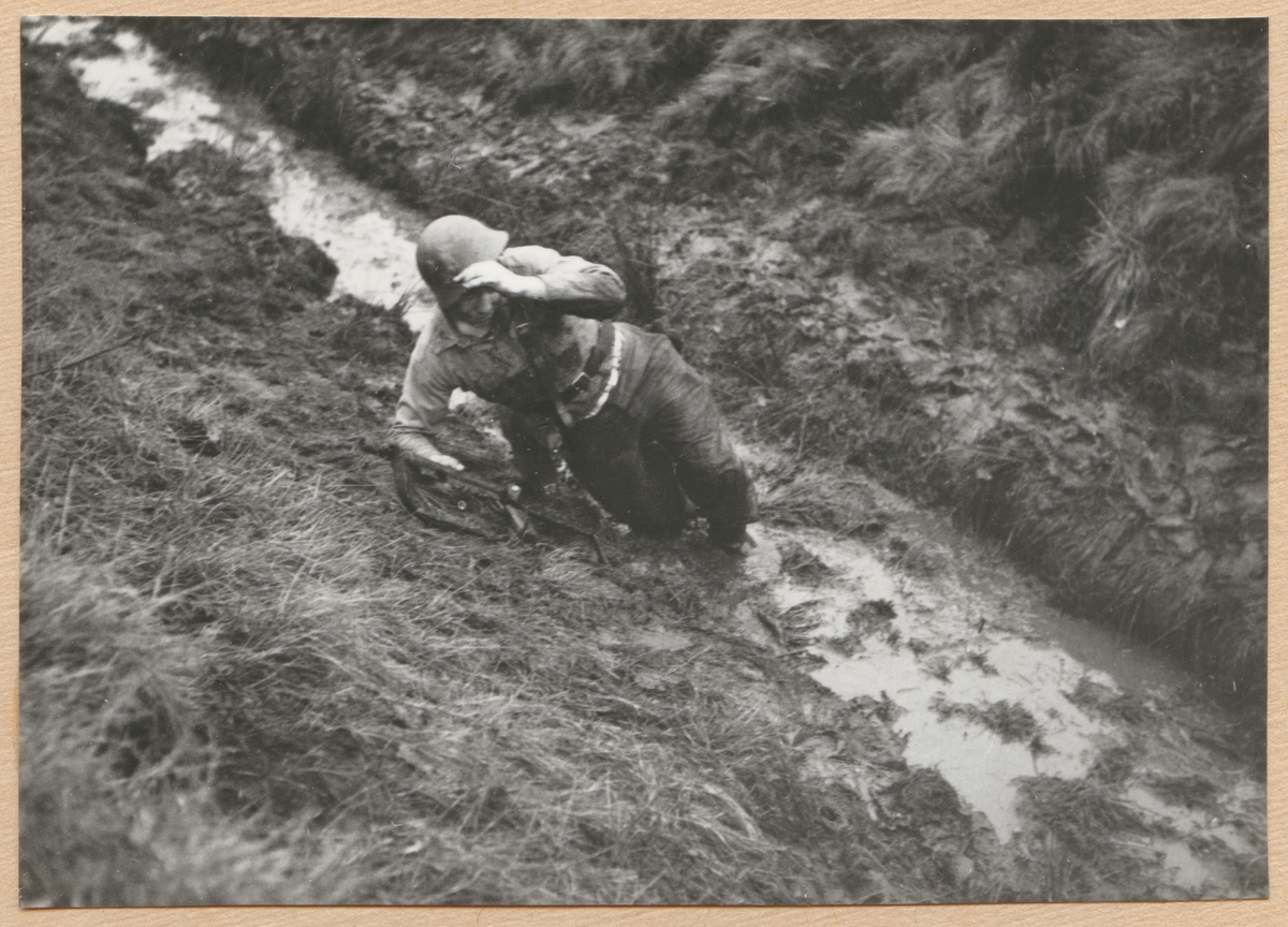 Bilden visar en värnpliktig som kämpar sig genom en lerig dike.