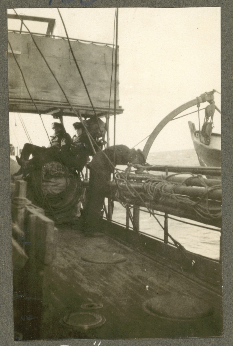 Bilden visar tre sjömän ombord på Fylgia. Medan två vilar avslappnade under bryggan hänger deras kamrat på relingen och matar måsarna.