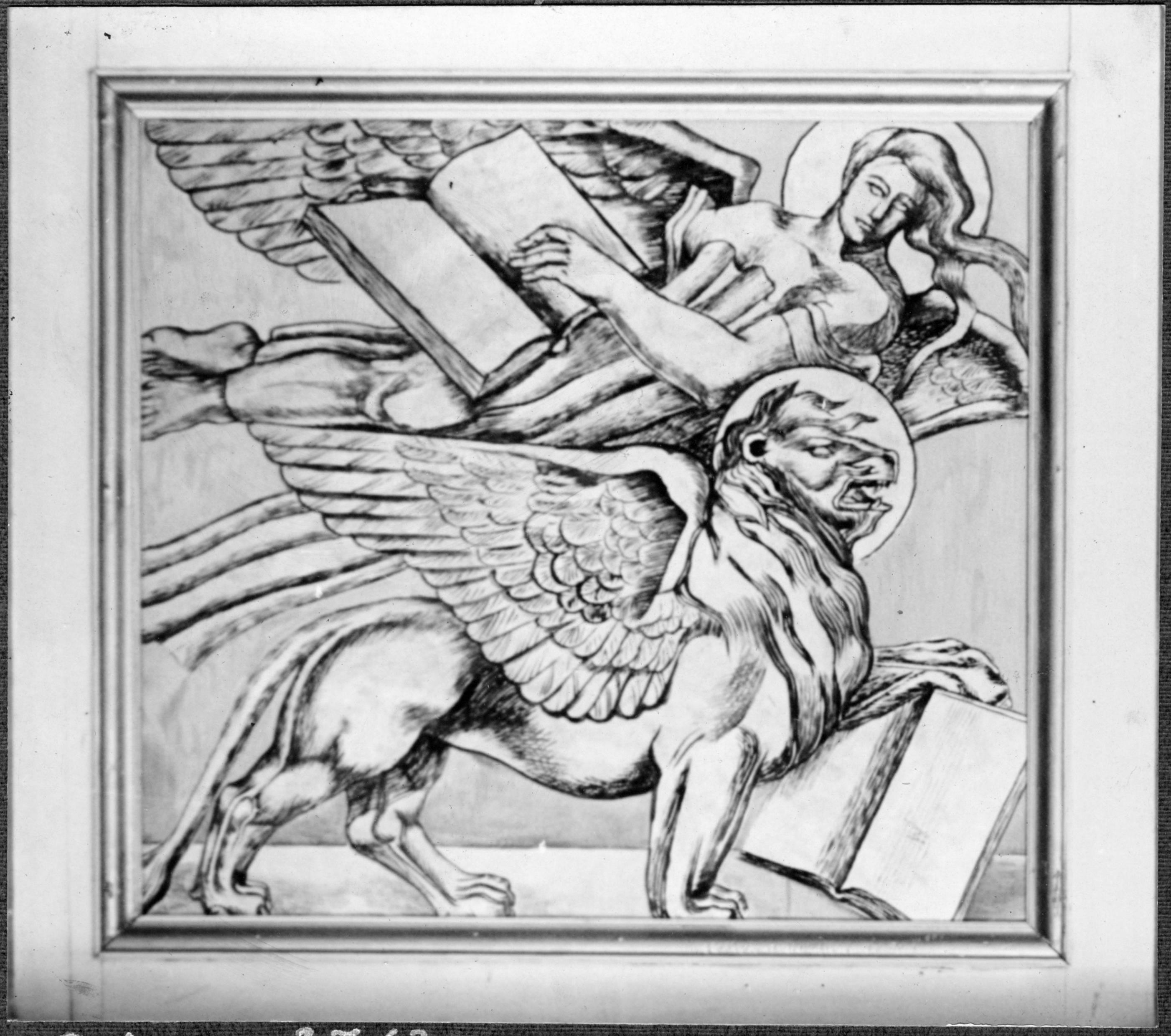 Pannå till vindfånget i kyrkans västra del, symboler för evangelisterna Matteus och Markus, av Gunnar Torhamn, 1928.