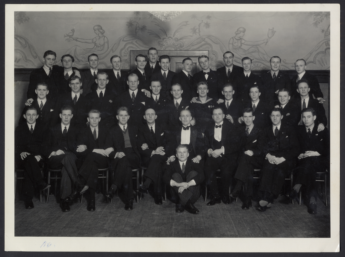 Bilden visar sjömän i civila kläder samlat för en gruppfoto under MUCK firandet 1934.