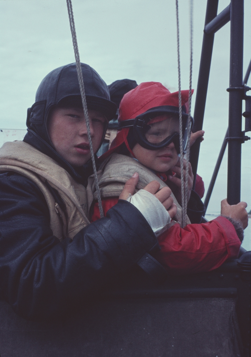 Bilden visar två barn i skyddkläder ombord på en motortorpedbåt.