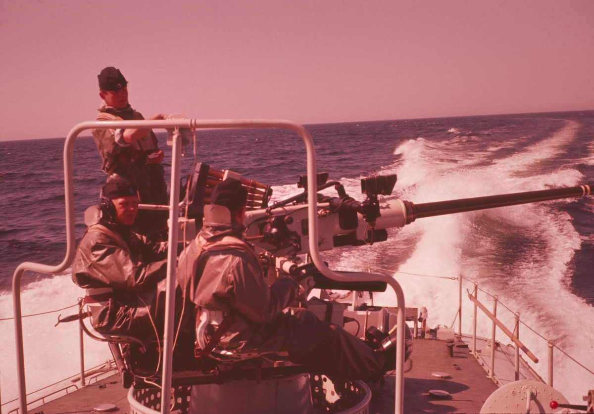 Besättningen på en motortorpedbåt i full fart handhar automatkanonen ombord.