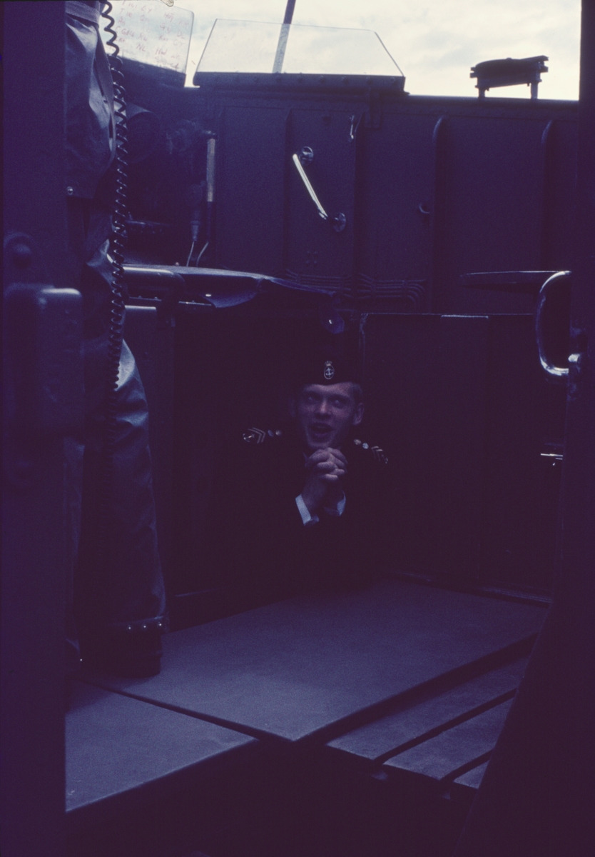 Bilden föreställer en porträtt av en kadett ombord på en motortorpedbåt.