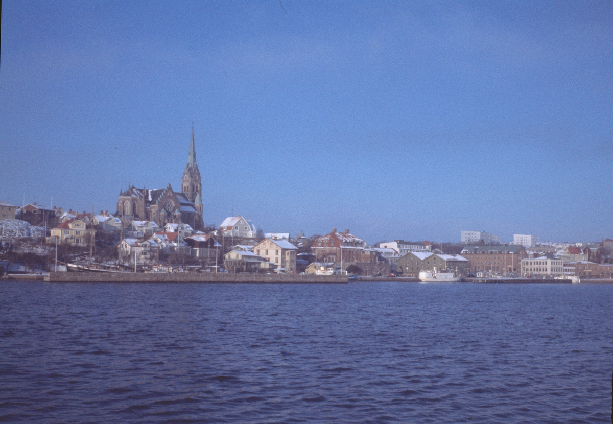 Fotografiet föreställer staden Lysekil med kyrka sett från havet.