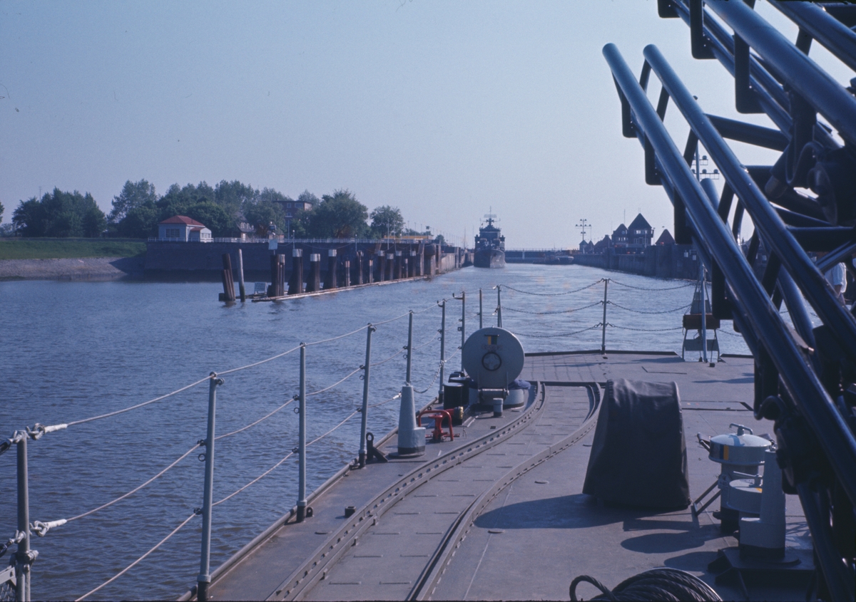 På bilden syns akterskeppet av jagaren Öland som har lämnat slussen i Kiel. I bakgrunden ser man slussen och jagaren Hälsingland.
