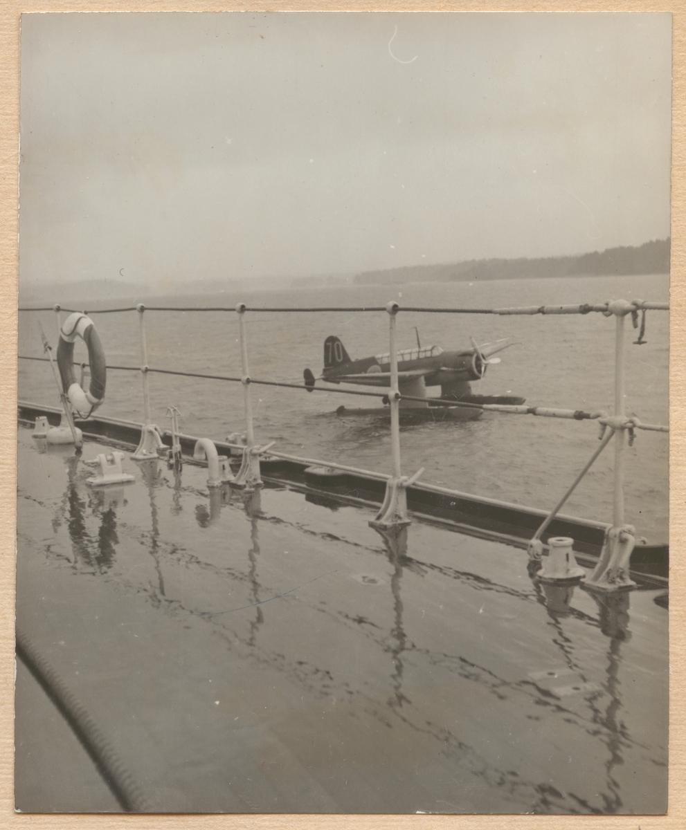 Bilden visar en Saab S 17 sjöflygplan som har landat på vattnet bredvid en örlogsfartyg.