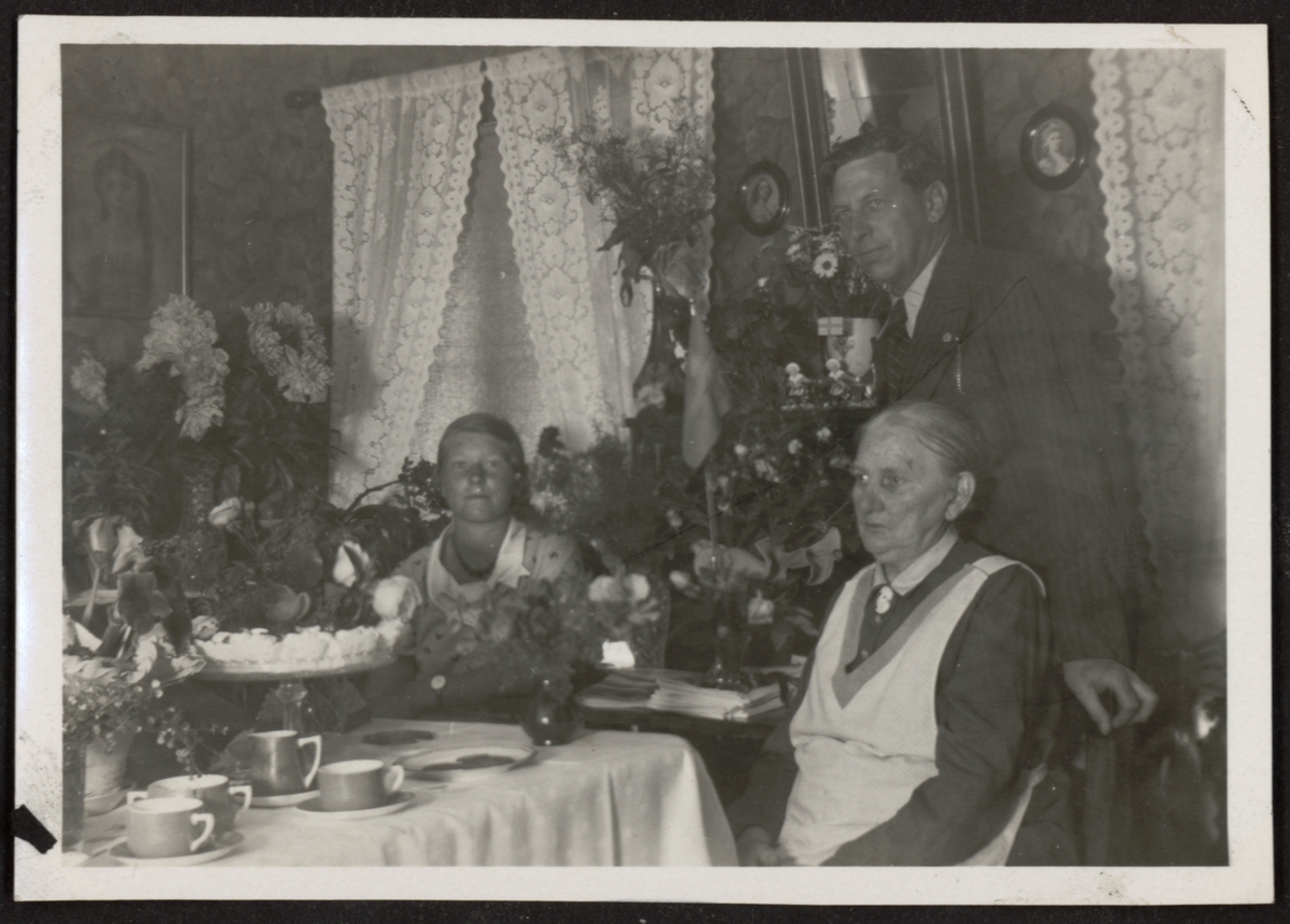 Bilden visar Hanna och Hugo Friberg vid ett kaffebord med en tårta och många blommor.