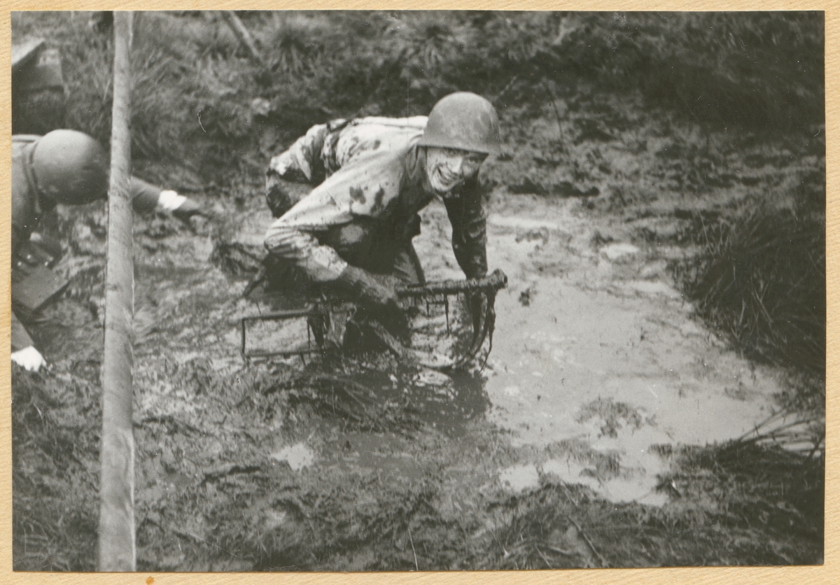 Här syns en glad värnpliktig som tycks tycker om att springer genom en slammig pöl under utbildningen.