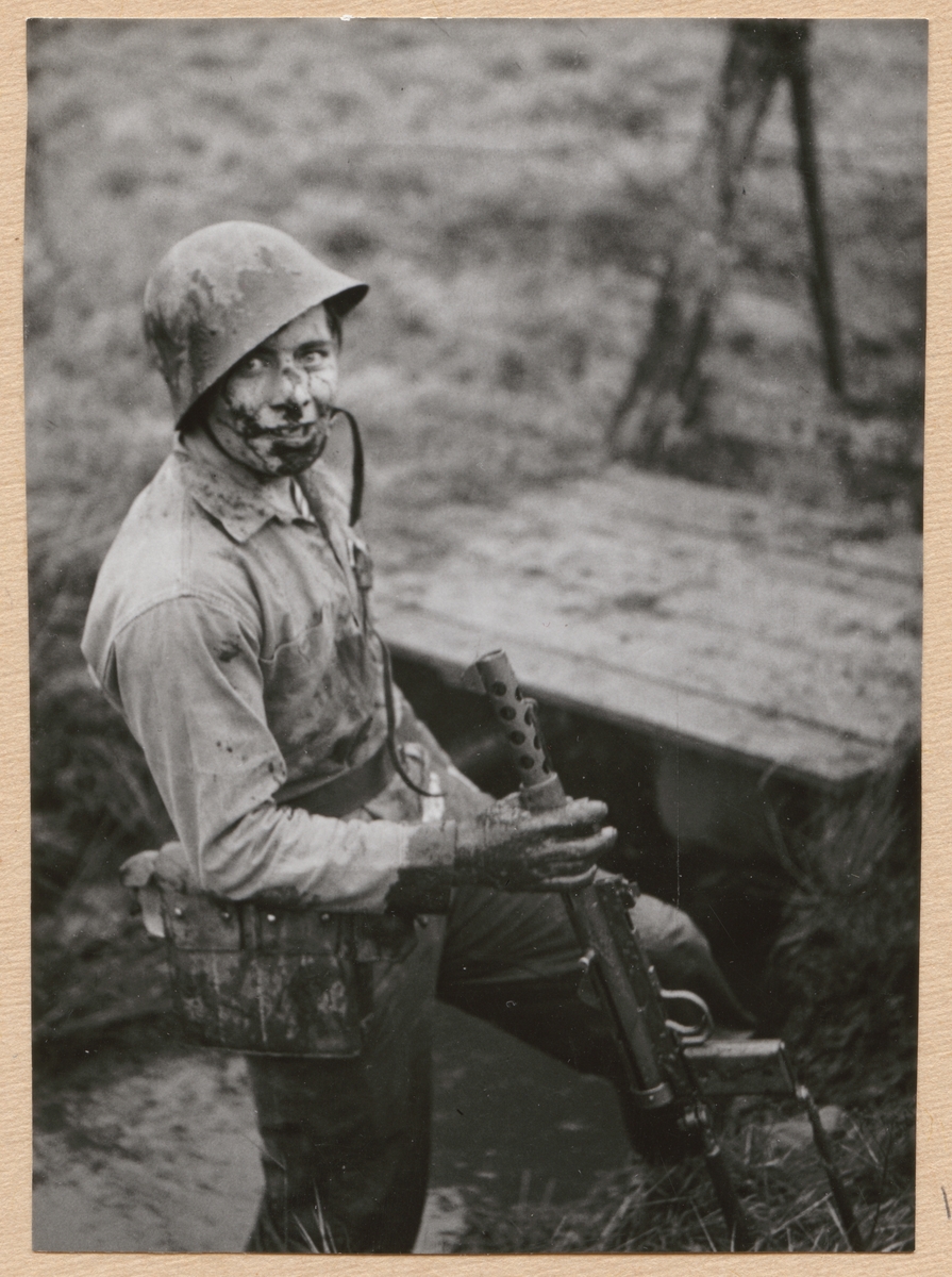 Bilden visar en lerig och nersmutsat värnpliktig som stiger ur en dike under utbildningen.