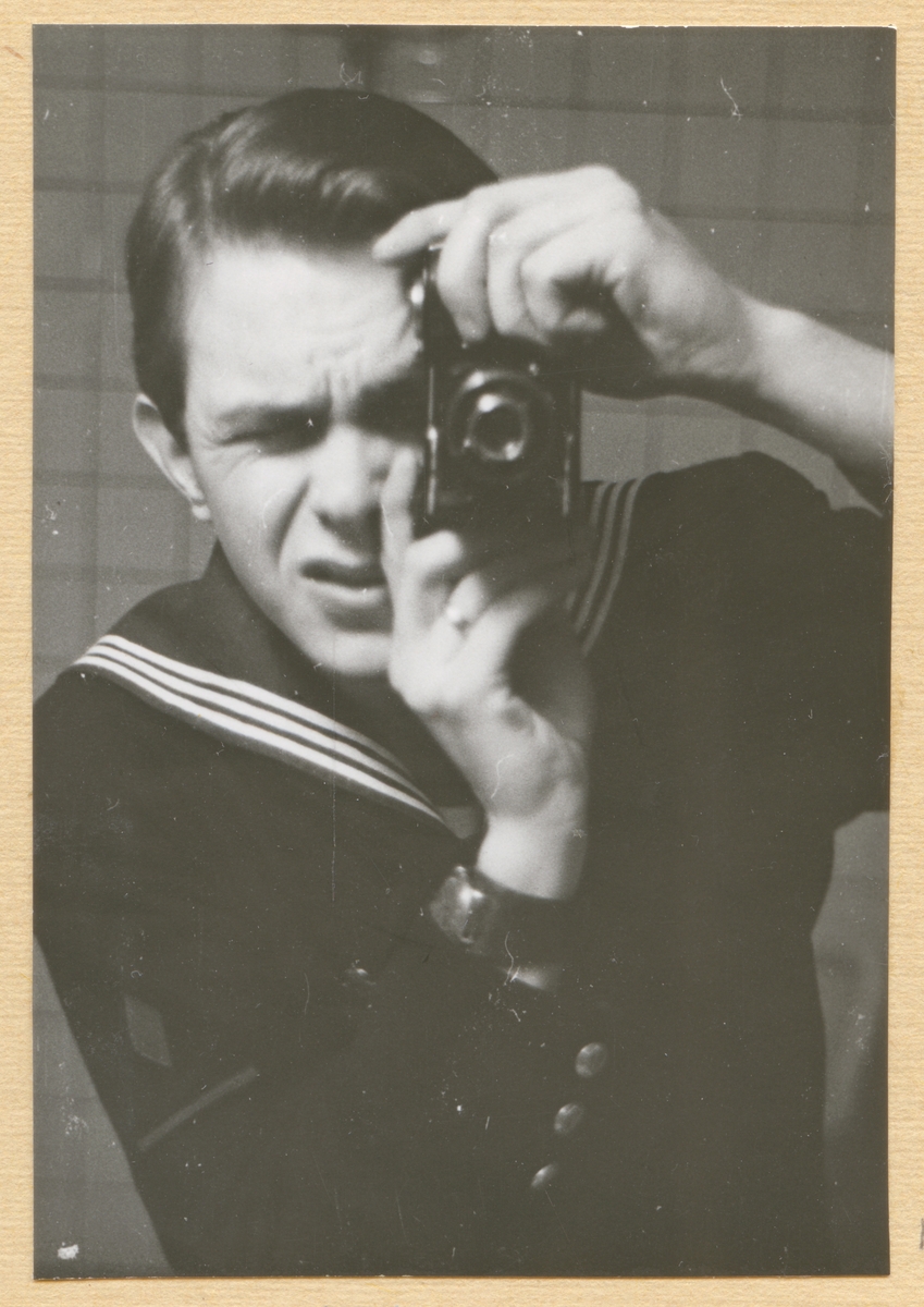 Värnplikte Bengt Berg ta en kort i en spegel.