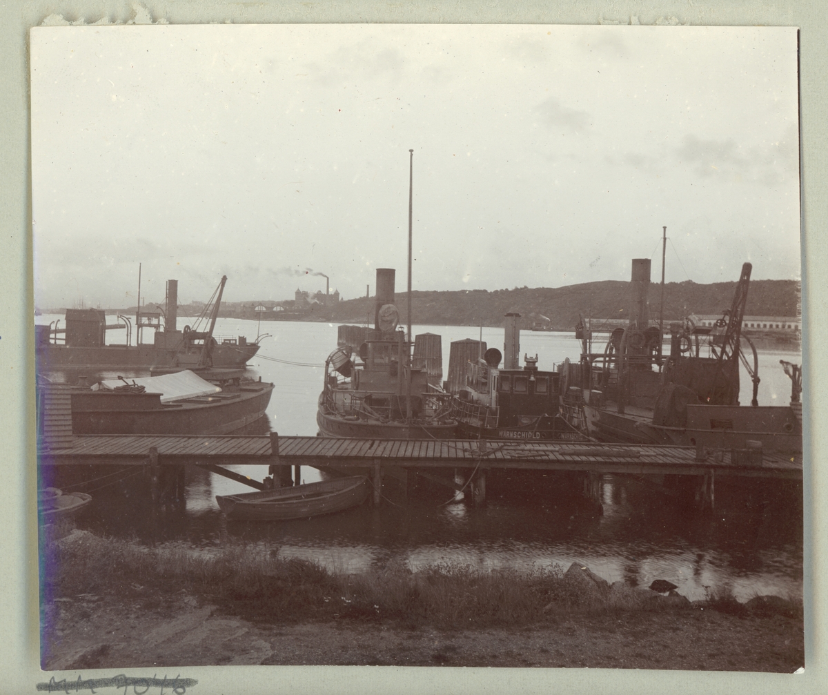 Bilden visar en rad mindre ångfartyg som ligger förtöjt vid en brygga på Örlogsbas väst.