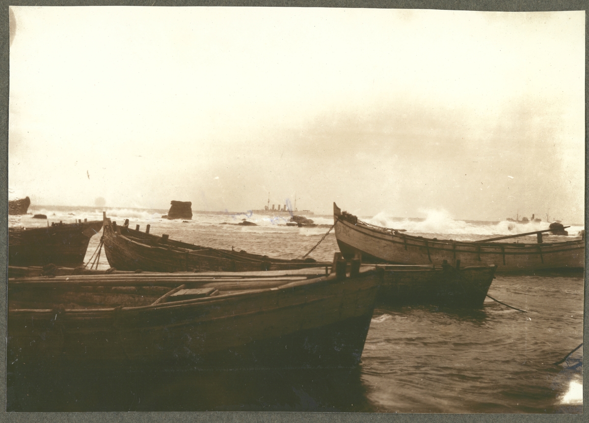 Bilden visar småbåtar som ligger förtöjda vid stranden. I bakgrunden bryts havsvågor mot en grynna.