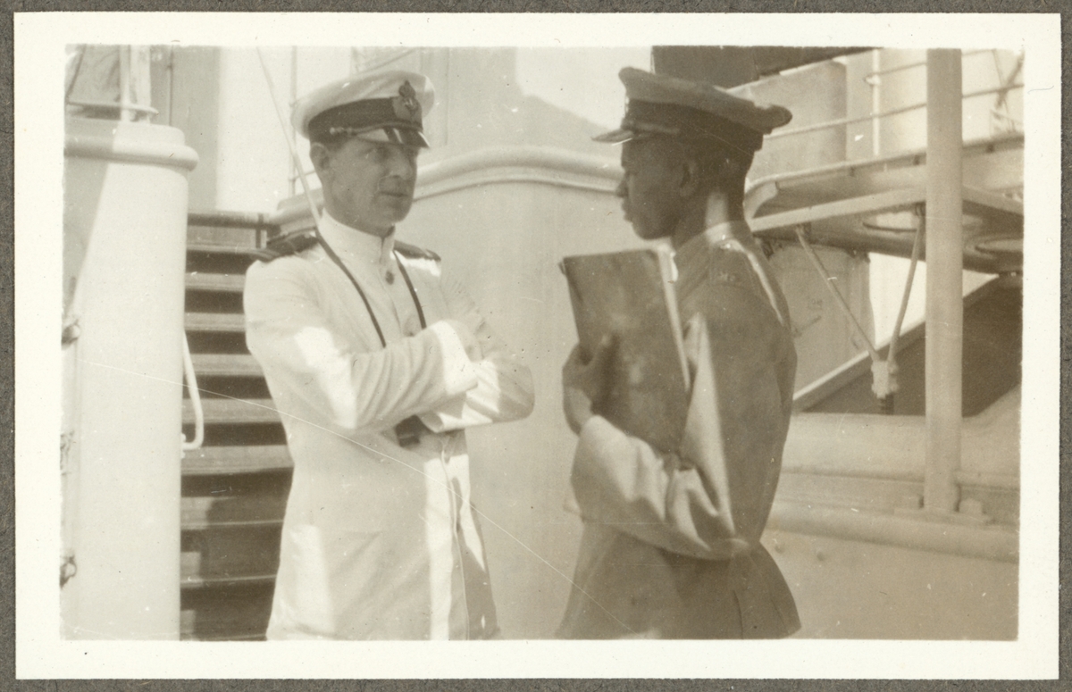 Bilden visar en av Fylgias officerare i samtal med en svart man.
