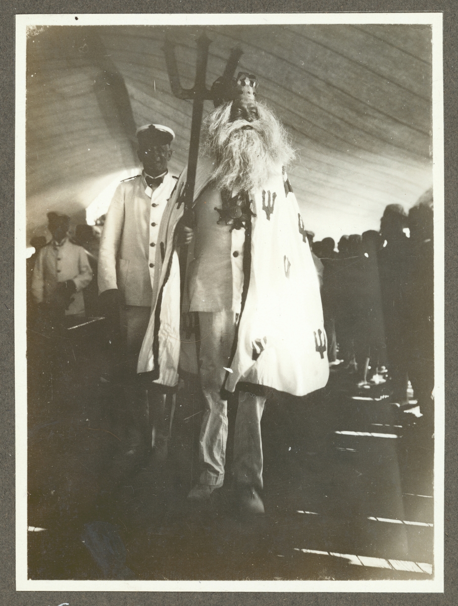Bilden visar en sjöman som är utklädd som havets kung Neptun under linjedopet på Fylgia.