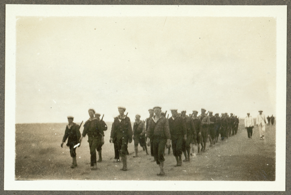 Bilden visar besättningsmän från pansarkryssaren som marscherar längs stranden på pansarkryssaren Point.