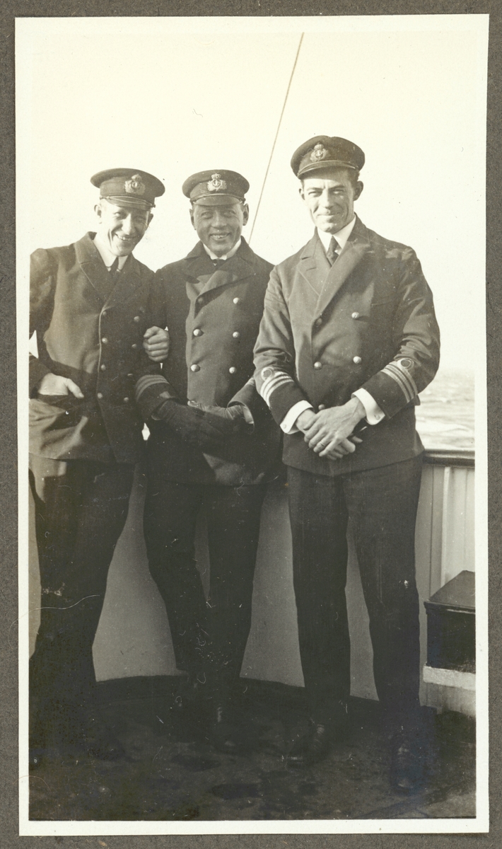 Bilden visar tre befäl från Fylgia som har det roligt.