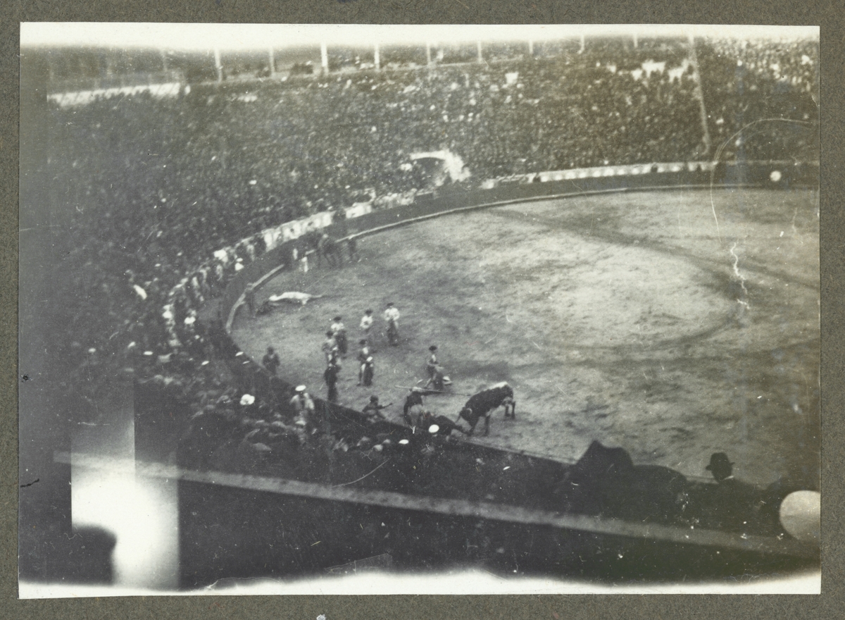 Bilden visar en pågående kamp i tjurfäktningsarenan av La Línea de la Concepción.