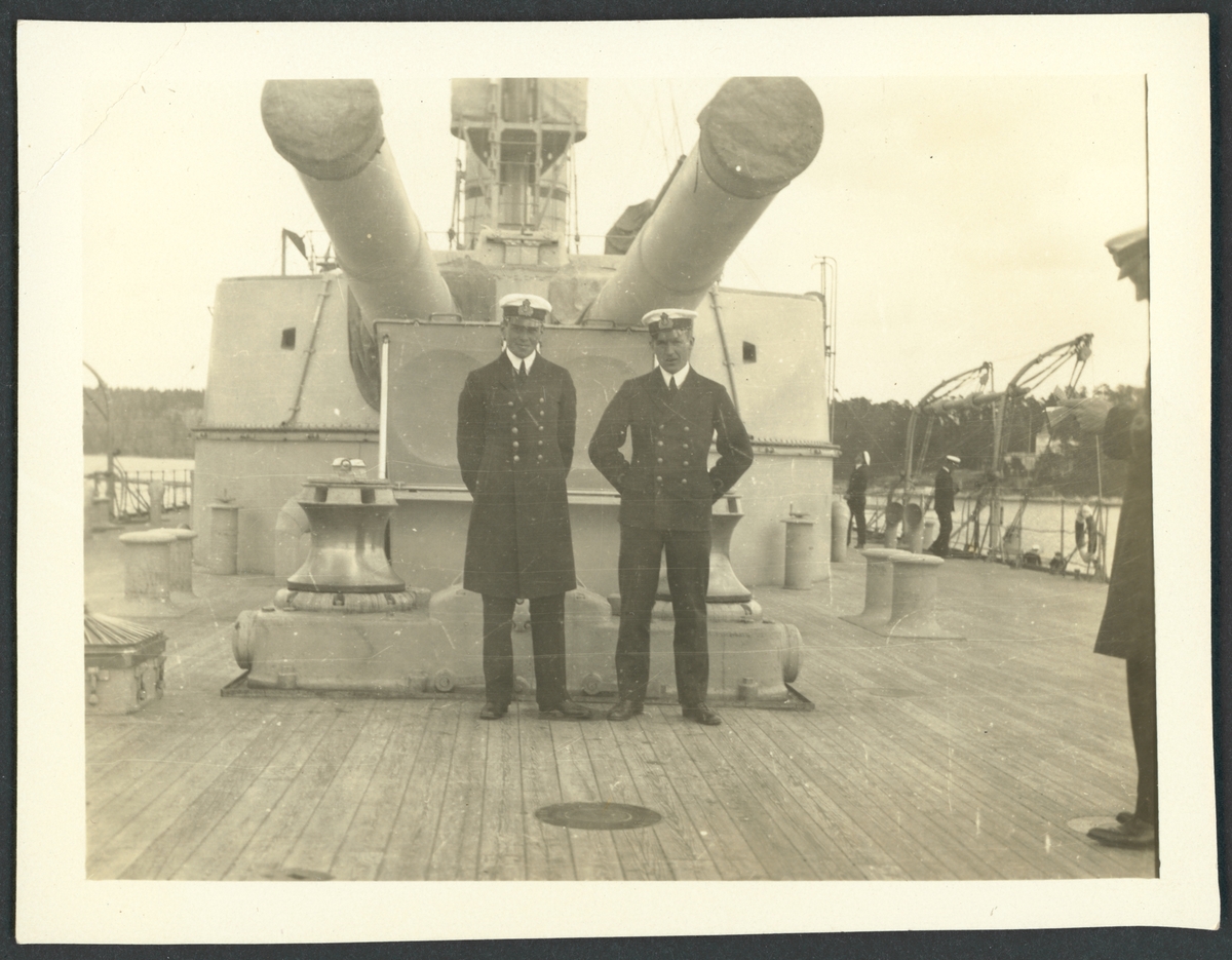 Bilden visar två sjöofficerare som står på däck av pansarkryssaren fylgia under kanonerna.