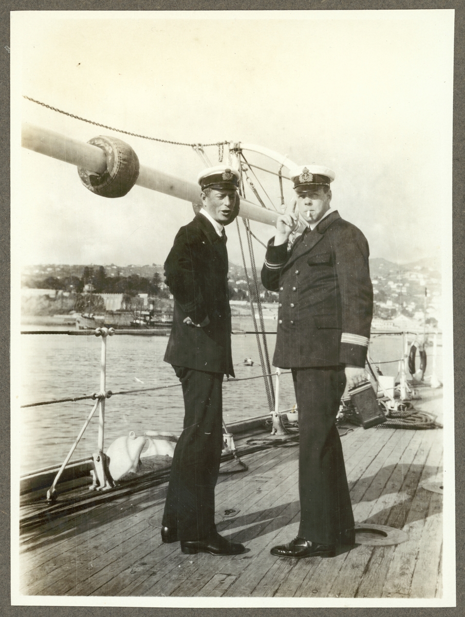 Bilden visar fartygschef Eklund och sekonden Schollin på däcket under besöket i Funchal.