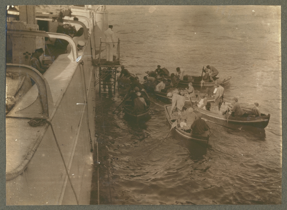 Bilden visar en grupp handlare i småbåtar som ligger långsides med Fylgia och erbjuder sina varor.