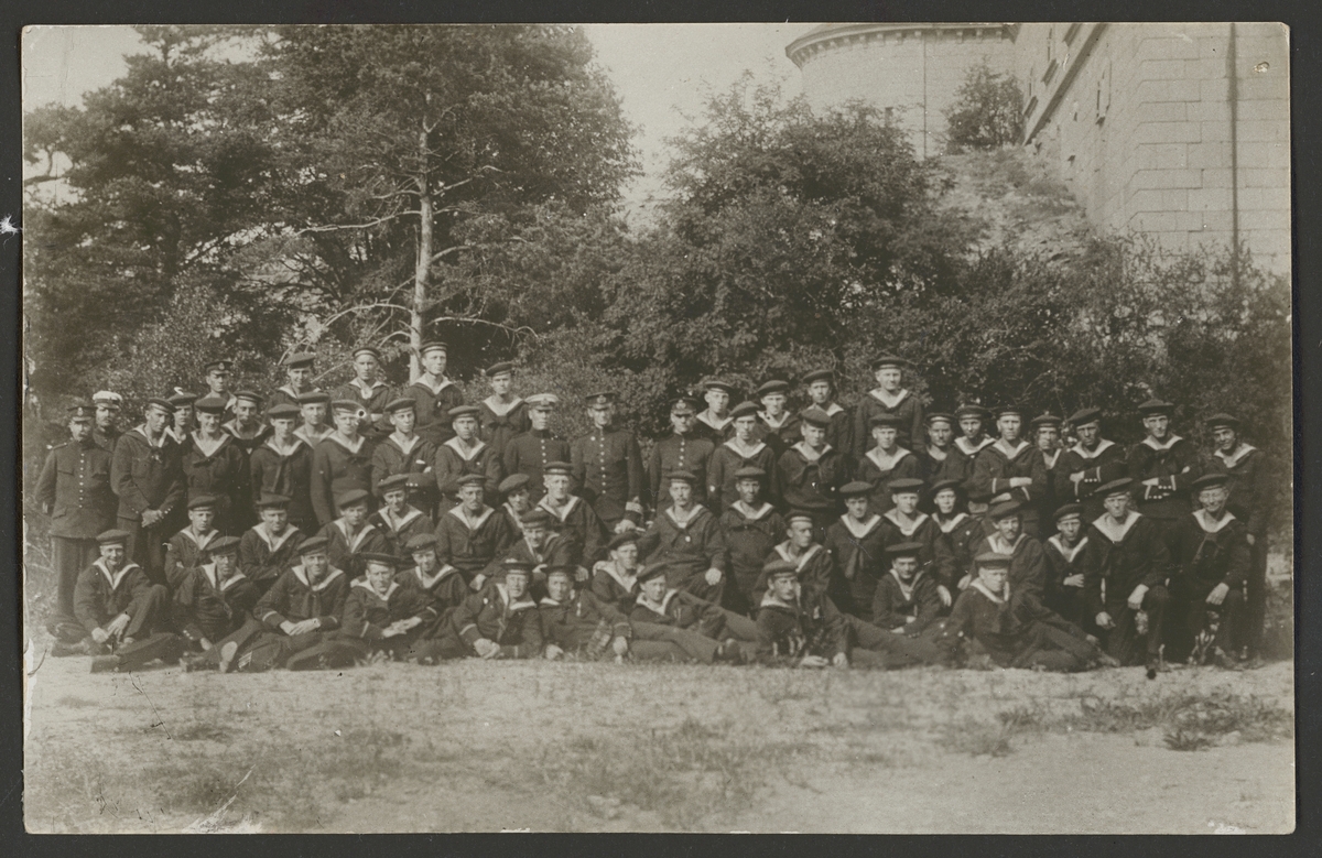 Bilden visar verksamheten från Vaxholms kustartilleri regemente, här uppställning av en kompani framför Rindö redutt.
