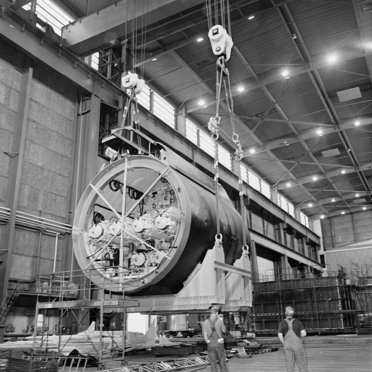 Titel: Utlyft av förstäven till A19 ubåten på lastpråm.