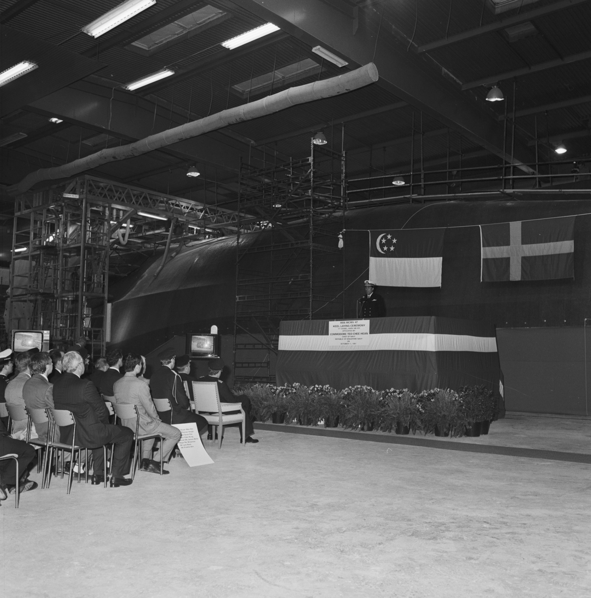 Bilden visar den singaporianske marinchefen som talar under ceremonin för kölsträckning av fartyget nr 435.