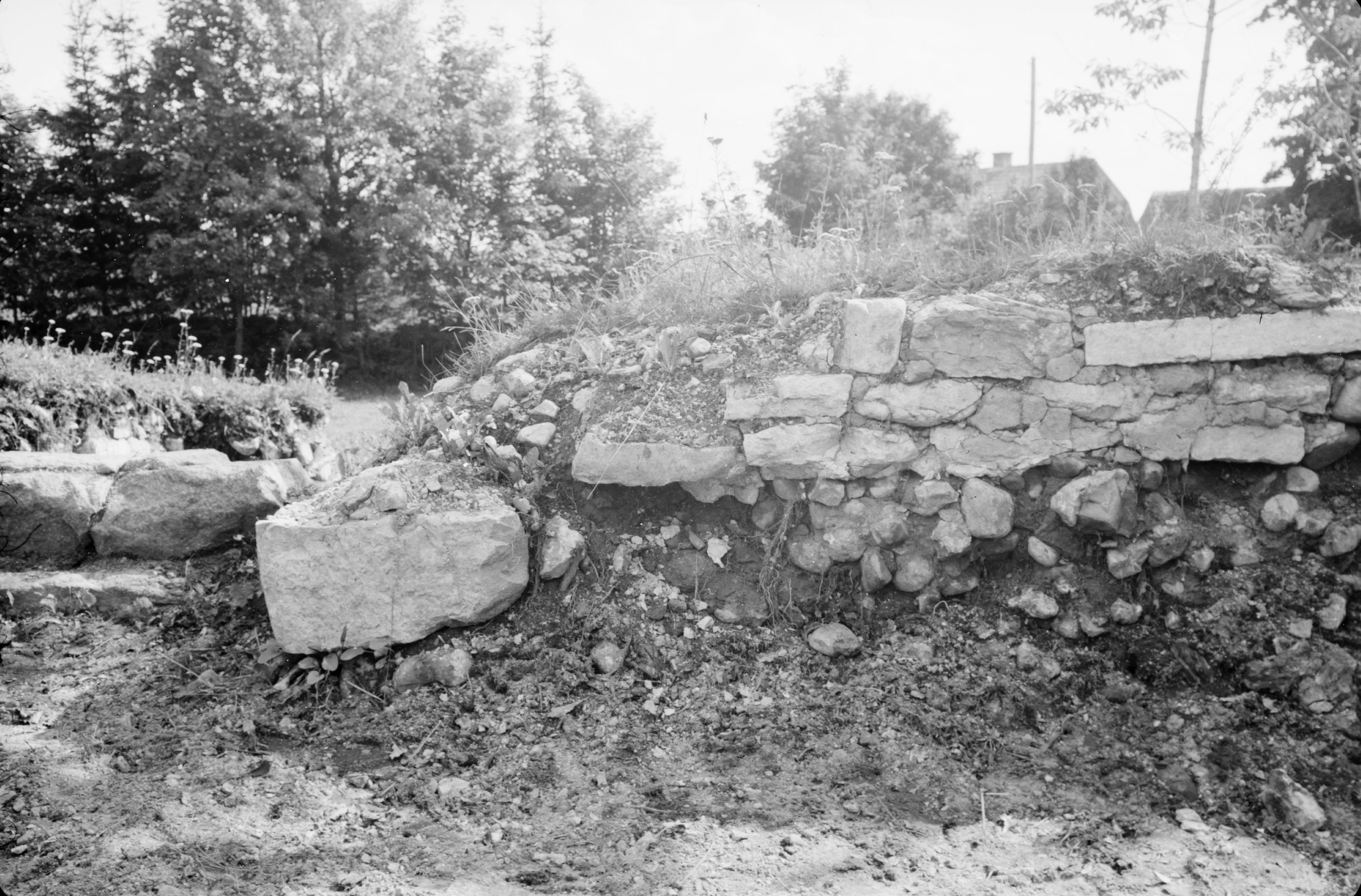 Långhuset, södra väggen mellan portalen och sydvästra hörnet. Insidan efter schaktning.